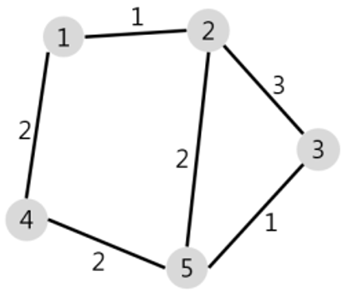ํ๋ผ๋ฏธํฐ๊ฐ N=5, road=[[1,2,1],[2,3,3],[5,2,2],[1,4,2],[5,3,1],[5,4,2]] ์ผ ๋ ๊ฑฐ๋ฆฌ ๋ฐฐ์ด, ํ์ ํ, ์ธ์ ๋ฆฌ์คํธ ๋ฐ ๋