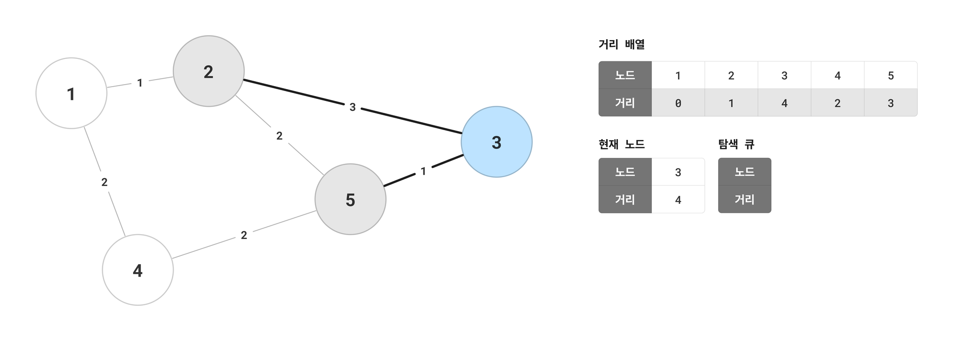 ๋ค์ ํ์ ํ์์ ๊ฑฐ๋ฆฌ๊ฐ ๊ฐ์ฅ ์งง์ ๋ ธ๋๋ฅผ ๊บผ๋ธ๋ค. ์์ ๋์ผํ๊ฒ ์ธ์ ํด ์๋ ๋ ธ๋์ ๊ฑฐ๋ฆฌ๋ฅผ ํ์ธํ๋ค. ํ์ง๋ง ์ต๋จ ๊ฑฐ๋ฆฌ ๋ฐฐ์ด์ ๋ชจ๋ ์์ฑํ์ผ๋ฏ๋ก ํ์ ์๋ N4, N5, N3์ ๋ชจ๋ ๊บผ๋ด์ ํ์ธํด๋ ๊ฑฐ๋ฆฌ ๋ฐฐ์ด์ ์๋ ๊ฐ์ด ๋ ์์ผ๋ฏ๋ก ๋ณ๊ฒฝ๋๋๊ฑด ์๋ค.