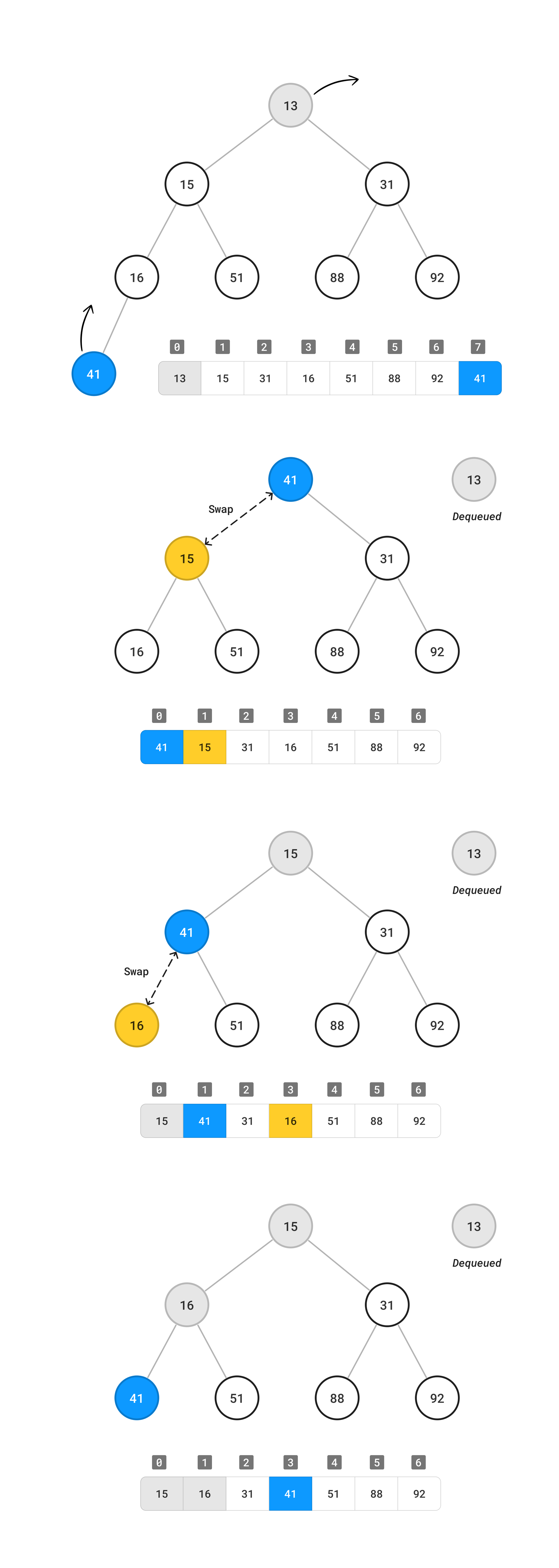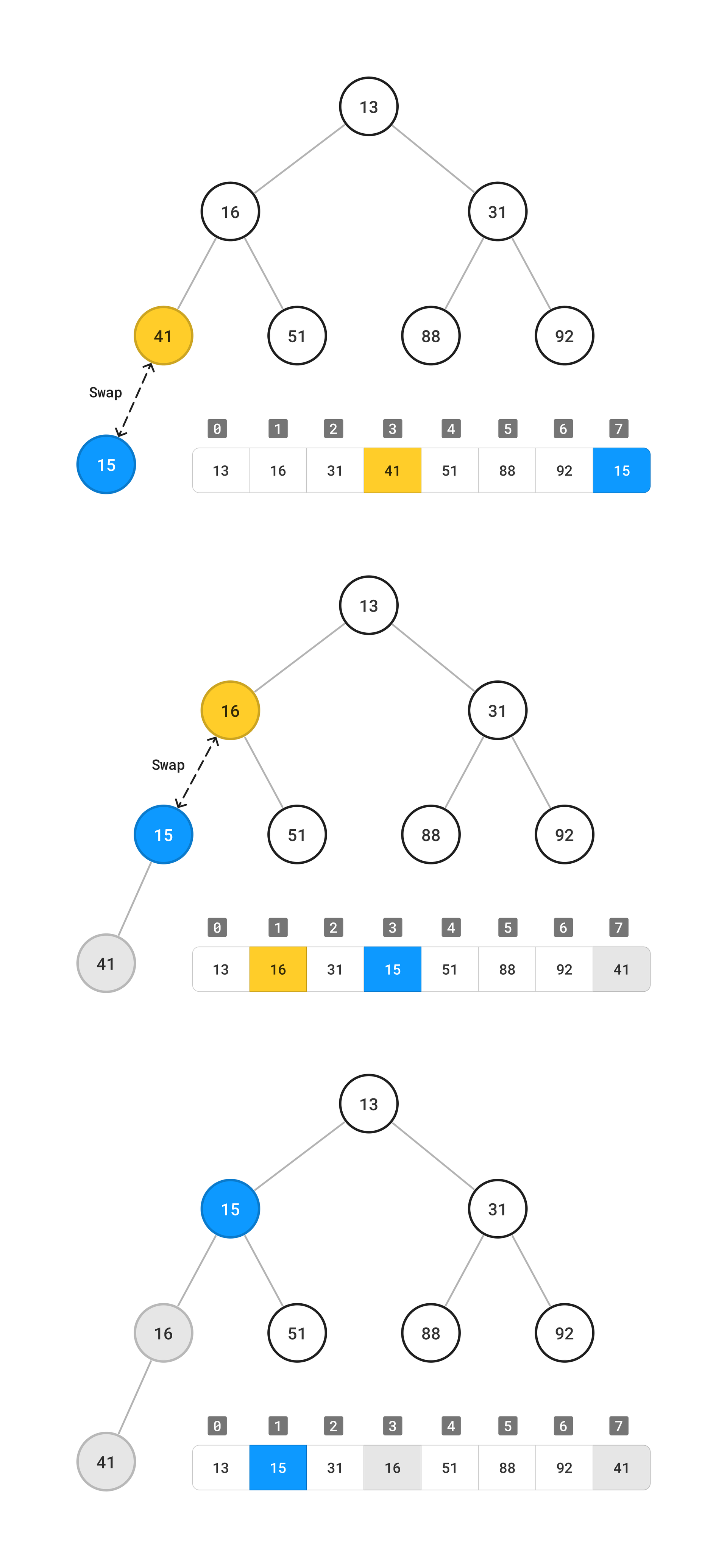๐ก ๋ฐฐ์ด ๋ง์ง๋ง ์์๋ก ์ญ์ ํ ๋ฃจํธ ๋ ธ๋ ์๋ฆฌ๋ฅผ ์ฑ์ฐ๋ ์ด์ : ๋ฐฐ์ด ๋ง์ง๋ง ์์๋ฅผ ๊บผ๋ด๋ ์์ ์ $O(1)$ ์์ ์๊ฐ ๋ณต์ก๋๋ฅผ ๊ฐ๊ธฐ ๋๋ฌธ. ํ์์ ๋ฃจํธ ๋ ธ๋๋ฅผ ์ญ์ ํ๋ฉด ํ ๊ตฌ์กฐ๋ฅผ ์ ์งํ๊ธฐ ์ํด ๋ค๋ฅธ ๋ ธ๋๋ก ๊ทธ ์๋ฆฌ๋ฅผ ์ฑ์์ผ ํ๋ค. ๋ฐฐ์ด ๋ง์ง๋ง ์์๋ฅผ ์ฌ์ฉํ๋ฉด ์ถ๊ฐ์ ์ธ ์์ ์ด๋ ์์ด ๋น ๋ฅด๊ฒ ๋ฃจํธ์ ๋น ์๋ฆฌ๋ฅผ ์ฑ์ธ ์ ์์ด, ํ์ ์ฌ์ ๋ ฌ์ ์์ํ๋ ๊ฐ์ฅ ํจ์จ์ ์ธ ๋ฐฉ๋ฒ์ด๋ค.