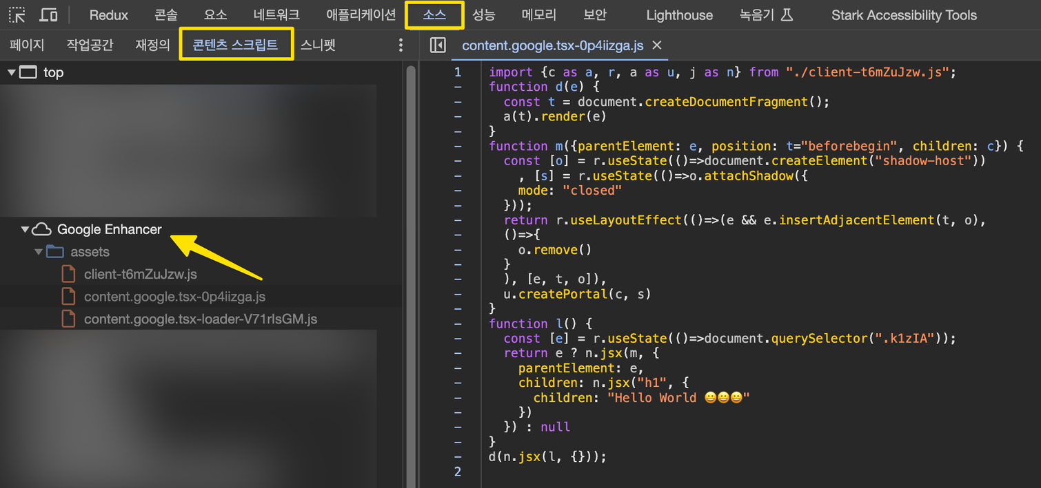 ์ธ ๋ฅผ ๋ก๋ํ๊ณ ๋ ๋๋ง ํ๋ค. manifest.json์์ ์๋ ํ์ผ์ ์คํฌ๋ฆฝํธ ๊ฒฝ๋ก๋ก ์ค์ ํ๋ฉด google.com ์ ์์ ์๋์ผ๋ก ์คํ๋๊ณ ์ฃผ์