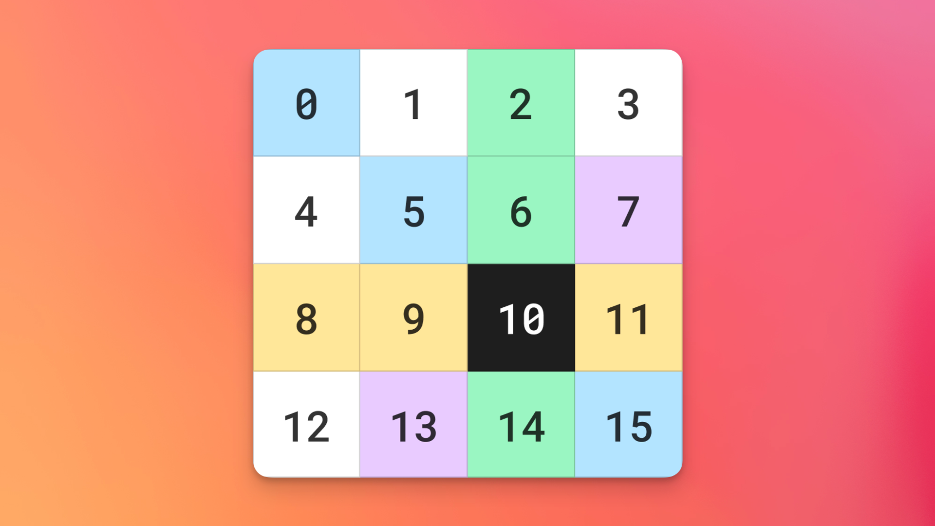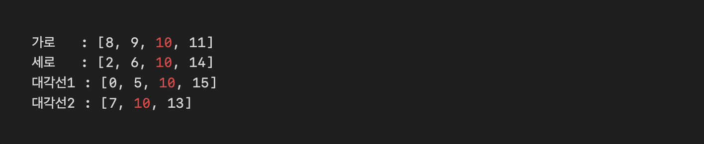 ๋ง์ง๋ง ๋์๋ ๊ฒฉ์ ์์น๋ฅผ ๊ธฐ์ค์ผ๋ก ๊ฐ๋ก, ์ธ๋ก, ๋๊ฐ์ ๋ฐฉํฅ์ผ๋ก ์น๋ฆฌ ์กฐ๊ฑด ์ ๋งํผ ๊ฒฉ์๋ฅผ ๊ฒ์ฌํ๋ฉด ๋ณด๋ ํฌ๊ธฐ๋ ์น๋ฆฌ ์กฐ๊ฑด์ด ๋์ ์ธ ๊ฒฝ์ฐ์๋ ์น๋ฆฌ ์ฌ๋ถ๋ฅผ ๊ฒ์ฌํ ์ ์๋ค. ์๋ฅผ๋ค์ด 4×4 ๋ณด๋์์ 10๋ฒ ์ธ๋ฑ์ค์ ๋์๋ค๋ฉด ํด๋น ์ธ๋ฑ์ค๋ฅผ ๊ธฐ์ค์ผ๋ก ๊ฐ๋ก, ์ธ๋ก, ๋๊ฐ์ ๋ฐฉํฅ์ผ๋ก ์น๋ฆฌ ์กฐ๊ฑด์ ๋ง์กฑํ๋์ง ๊ฒ์ฌํ๋ฉด ๋๋ค.