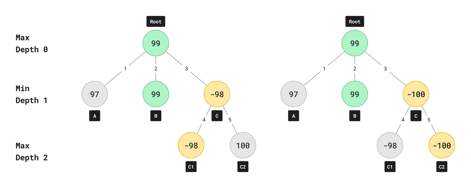 ธ๋ ์ค ๊ฐ์ฅ ํฐ ๊ฐ์ bestScore๋ก ์ค์ ํ๊ณ , ์ต์ํ ๋จ๊ณ์ผ ๋ ๊ฐ์ฅ ์์ ๊ฐ์ bestScore๋ก ์ค์ ํ๋ค. ์ด ๊ณผ์ ์ ์น๋ฆฌํ ํ๋ ์ด์ด๊ฐ ๋์ค๊ฑฐ๋ ๋ฌด์น๋ถ(๋ณด๋์ ๋ชจ๋ ์นธ์ ์ฑ์)๊ฐ ๋ ๋๊น์ง ํ์ ๋