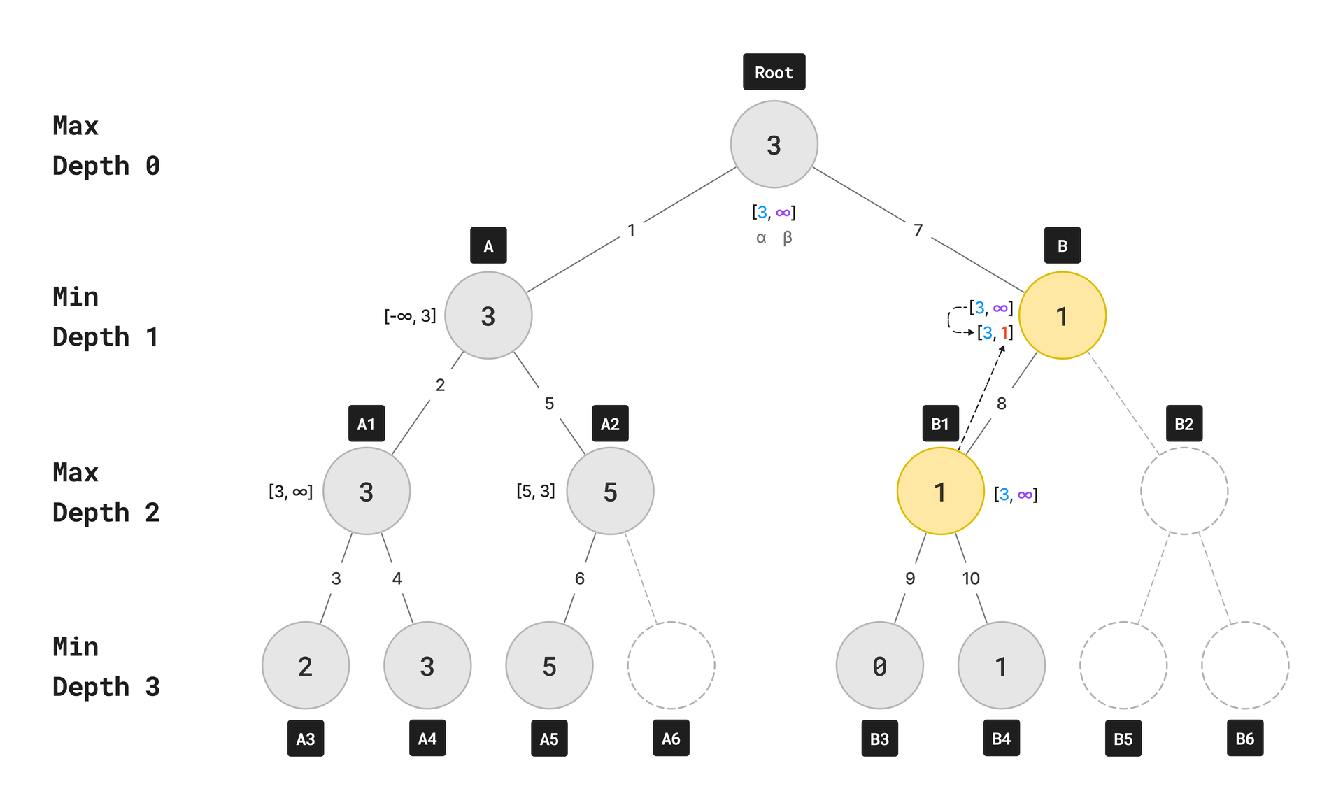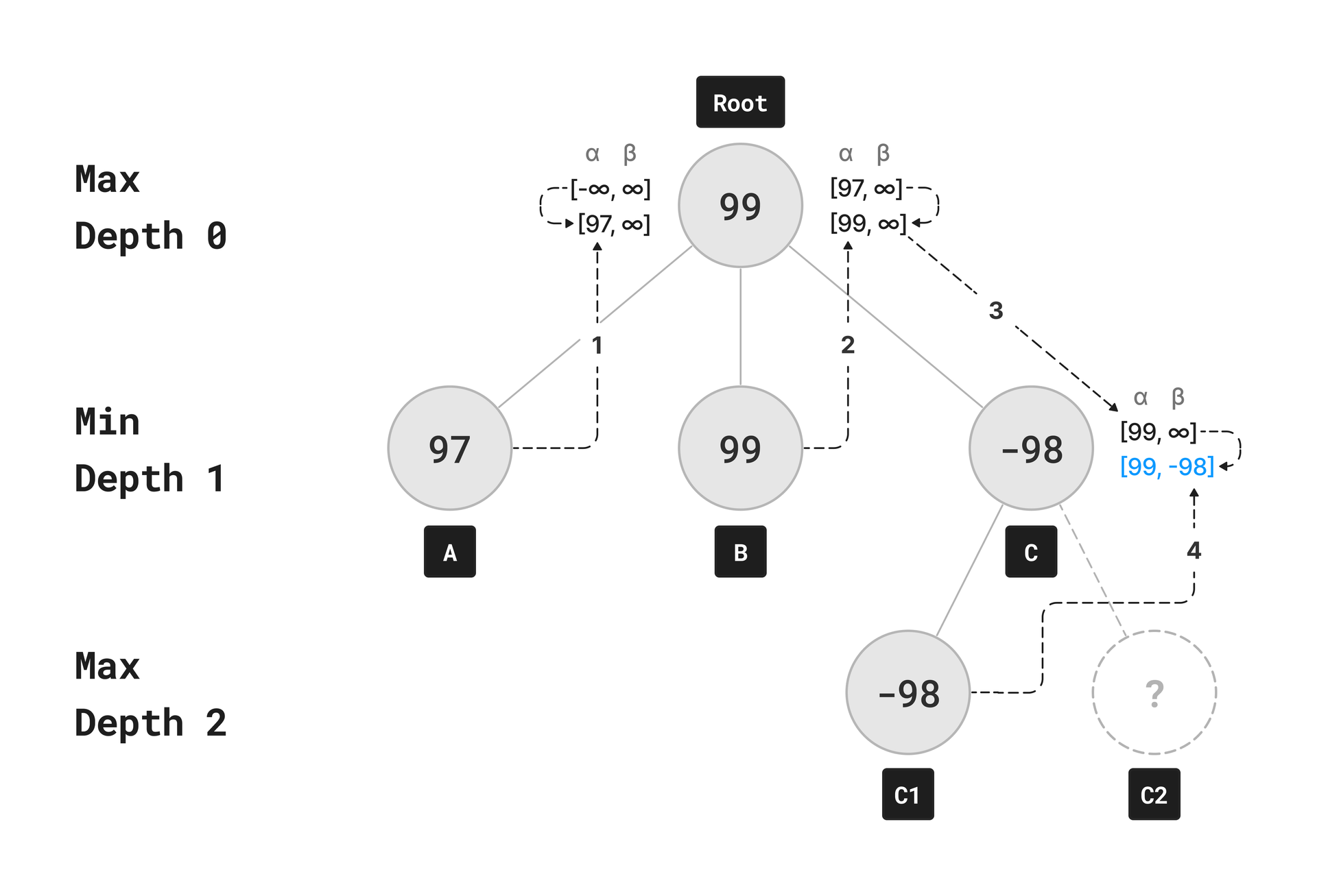 - $\alpha >= \beta$ ์ต์ ํด๋ฅผ ์ฐพ์ ์ํ : ์์ ๋ ธ๋ ํ์์ ์ค์งํ๋ค — ๊ฐ์ง์น๊ธฐ โ๏ธ