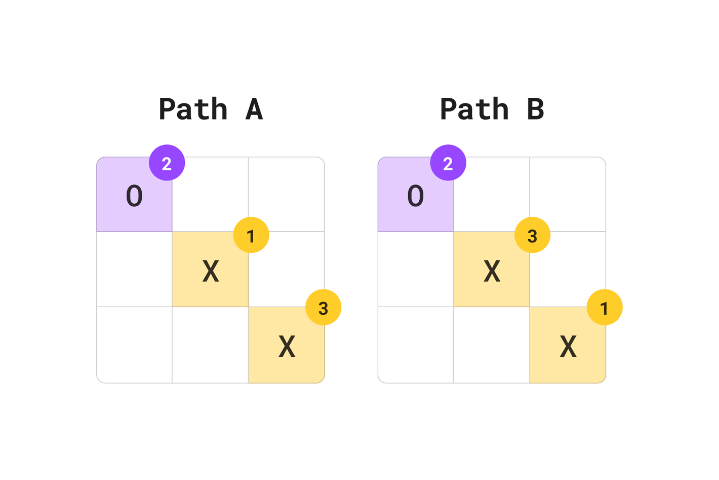 - ๊ฒฝ๋ก A : X ์ค์ → O ์ข์ธก ์๋จ → X ์ฐ์ธก ํ๋จ
