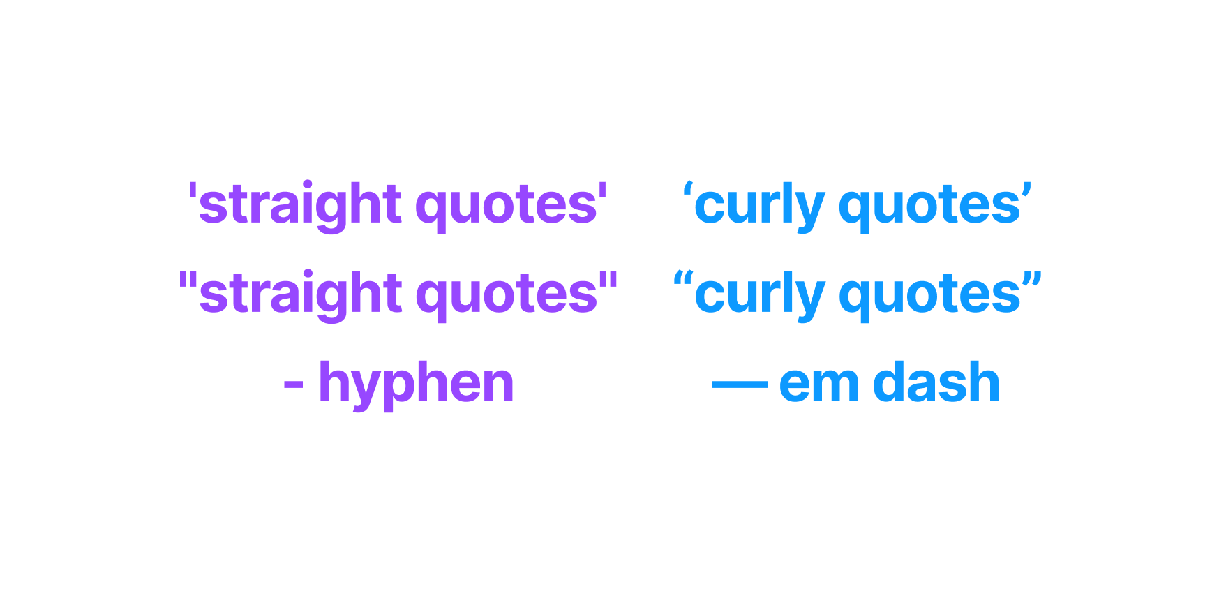 스마트 인용 부호 옵션을 활성화하면 직선 인용 부호를 곡선 인용 부호로 자동 변환한다. 또한 일반 하이픈(-)을 연속으로 두 번 입력했을 때 알파벳 M과 동일한 너비를 가지는 em 대시(—)로 변환된다. 곡선형 부호는 인용의 시작과 끝 지점을 명확히 구분할 수 있는 장점이 있지만 일부 프로그램에서 제대로 표시되지 않는 문제가 발생할 수 있다.