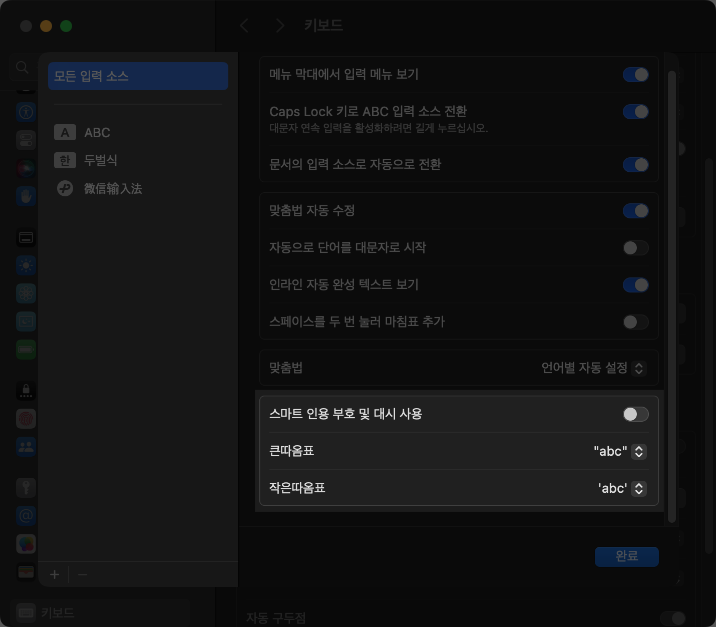 macOS는 입력 소스 설정 화면에서 "스마트 인용 부호 및 대시 사용"이라는 옵션을 제공한다. 입력 소스 설정은 시스템 설정 - 키보드 - 입력 소스 항목에서 편집 버튼을 클릭하면 확인할 수 있다. 이 설정 화면에서 큰따옴표, 작은따옴표의 표시 방식을 직접 지정할 수도 있다.