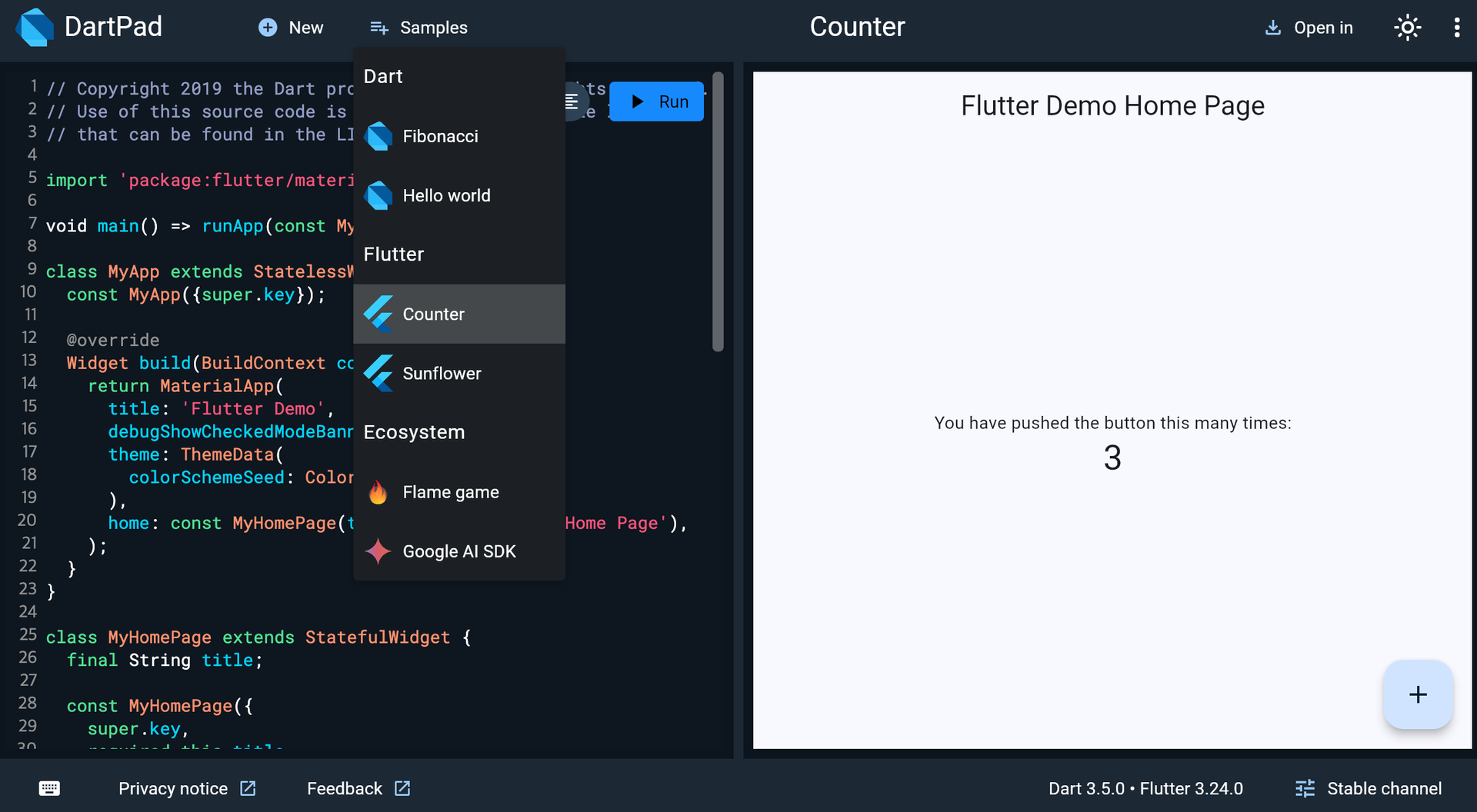 DartPad ์ฌ์ดํธ์์ ์ง์ ํ๋ฌํฐ ์ฝ๋๋ฅผ ์์ฑํ๊ณ ์คํํด ๋ณผ ์ ์๋ค. ์๋จ Samples ๋ฉ๋ด๋ฅผ ํด๋ฆญํ ๋ค ๋ฏธ๋ฆฌ ์ ์๋์ด ์๋ ํ๋ฌํฐ ํ ํ๋ฆฟ์ ์ ํํ ์ ์๋ค.