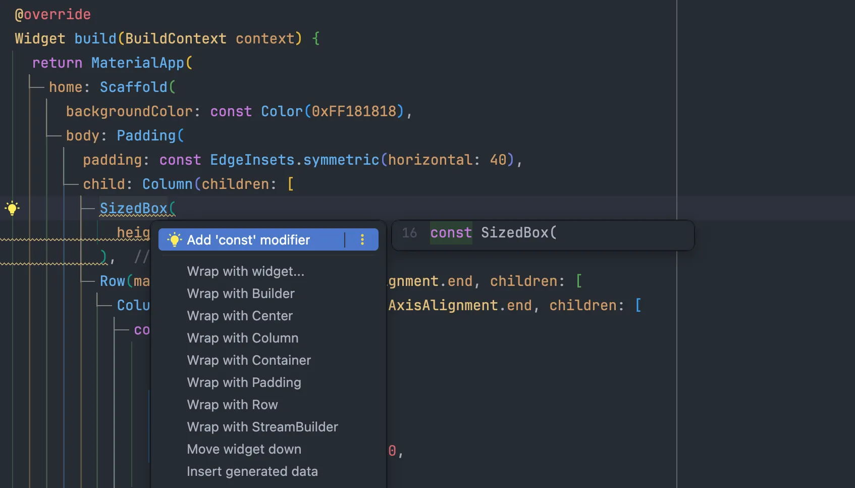 ๋จ์ถํค๋ฅผ ๋๋ฅด๊ฑฐ๋, ์ถ์ถํ๊ณ ์ถ์ ๊ณณ์์ ๋ง์ฐ์ค ์ฐํด๋ฆญ → Refactor → Extract Flutter Widget ๋ฉ๋ด๋ฅผ ํด๋ฆญํ๋ฉด ํ์ฌ ์ปค์๊ฐ ๊ฐ๋ฆฌํค๋ ์์ ฏ์ ๋ณ๋์ ํด๋์ค๋ก ์ถ์ถํ ์ ์๋ค. Extract Method ๋ฉ๋ด๋ฅผ ํด๋ฆญํ๋ฉด ์ ํ๋ ์ฝ๋๋ฅผ ๋ฉ์๋๋ก ์ถ์ถํ๋ค.
