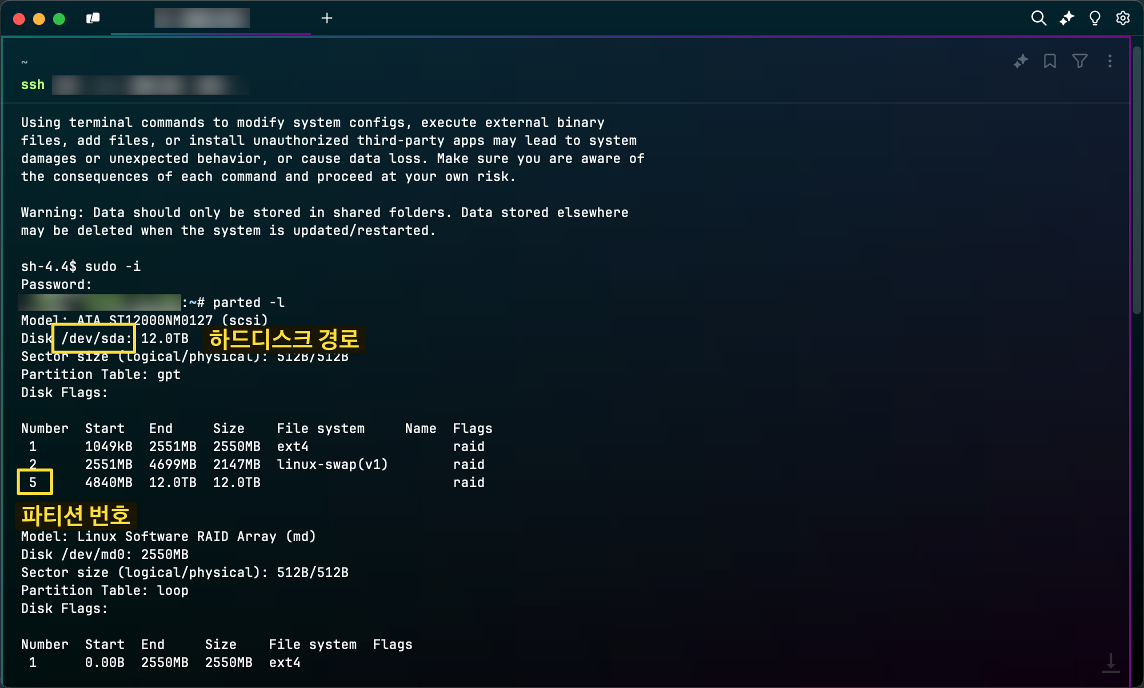 ❺ 파티션 용량 재설정. ⚠️ 위 단계에서 확인한 하드디스크 경로, 파티션 번호 및 확장할 용량을 입력한다. 잘못 입력하면 데이터 손실 등의 문제가 발생할 수 있으므로 실수하지 않도록 주의하자. 참고로 #(샵)으로 시작하는 부분은 주석이므로 명령어 실행시 무시된다.