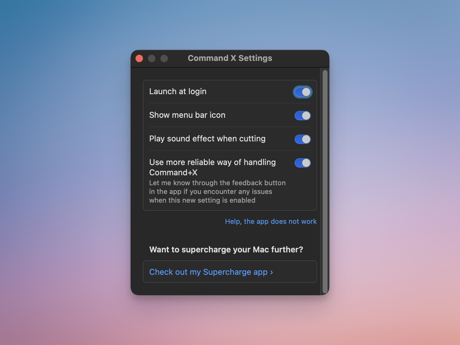 앱 설정 화면에선 "로그인 시 자동 실행(Launch at login)", "잘라내기 시 효과음 재생(Play sound effect when cutting)" 같은 옵션을 켤 수 있다. 잘라내기 단축키가 잘 작동하지 않는다면 "Command+X 처리를 더 안정적으로 수행(Use more reliable way of handling Command+X)" 옵션에 체크해 보자.