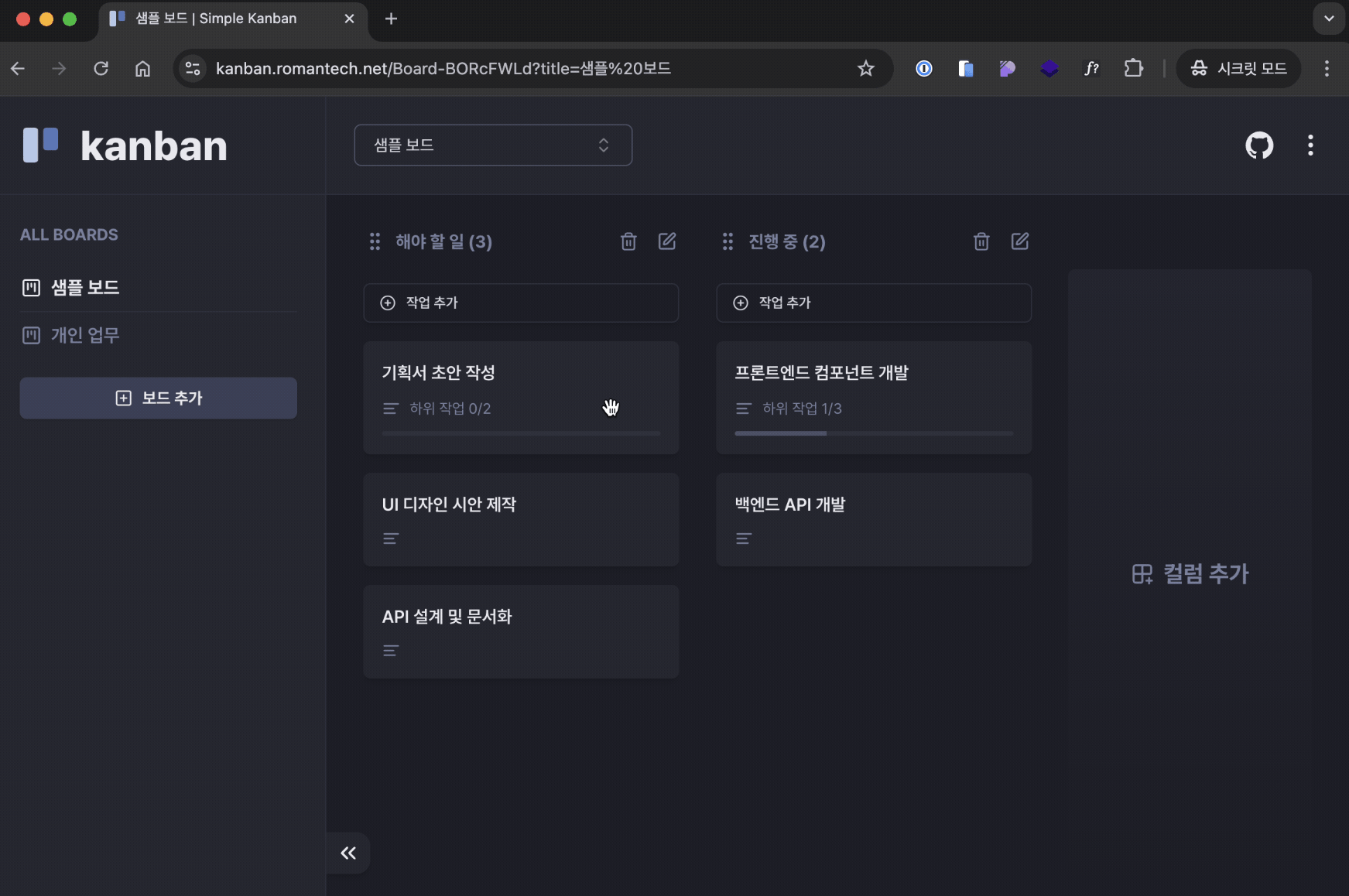 - ๋ ํฌ์งํ ๋ฆฌ: https://github.com/romantech/simple-kanban