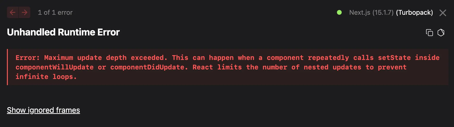 ์ ์ฌ๊ธฐ์ ๊ธฐ ๋๋๊ทธํ๋ค ๋ณด๋ฉด ๊ฐ๋ Maximum update depth exceeded(์ปดํฌ๋ํธ ๋ฌดํ ๋ฃจํ) ์๋ฌ๊ฐ ๋ฐ์ํ๋ค. ์ด ์๋ฌ๋ Sortable ํ๋ฆฌ์