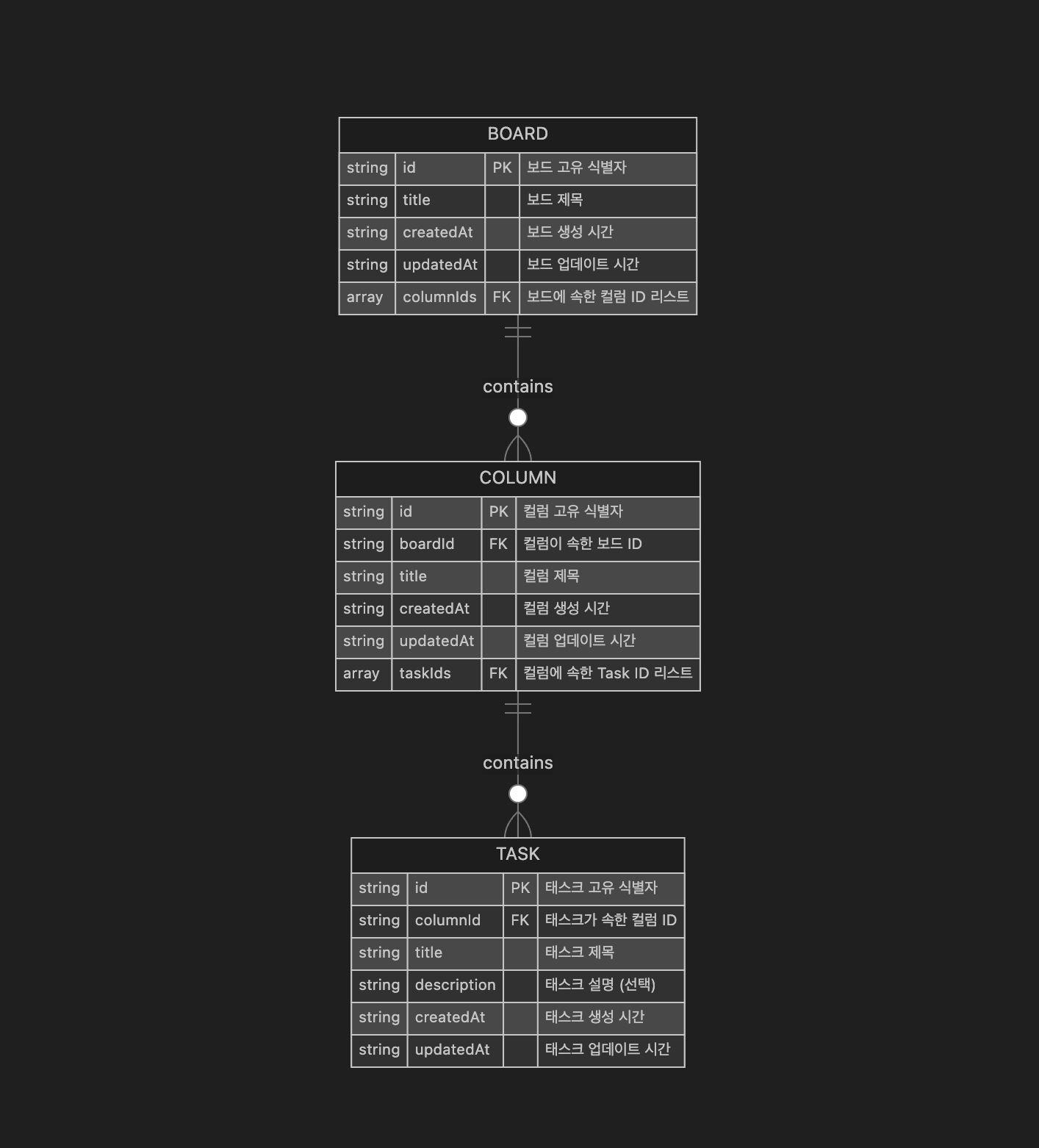 Record<TaskId, TaskDef>ํํ๋ก ์ ์ฅํ๋ฉด O(1) ์๊ฐ ๋ณต์ก๋๋ก ๋ฐ์ดํฐ ์กฐํ ๊ฐ๋ฅboardId,columnId๊ฐ์ FK(Foreign Key, ์ธ๋ ํค)๋ฅผ ์ฌ์ฉํ์ฌ ์ฐธ์กฐ ๋ฌด๊ฒฐ์ฑ ๋ณด์ฅ- ํ์์ ๋ฐ๋ผ