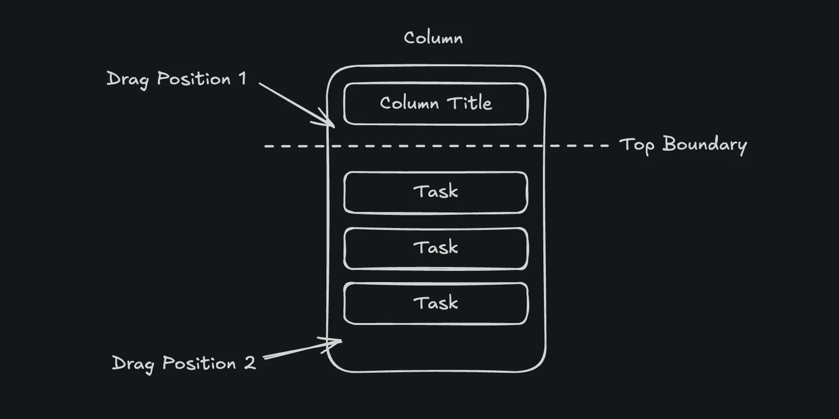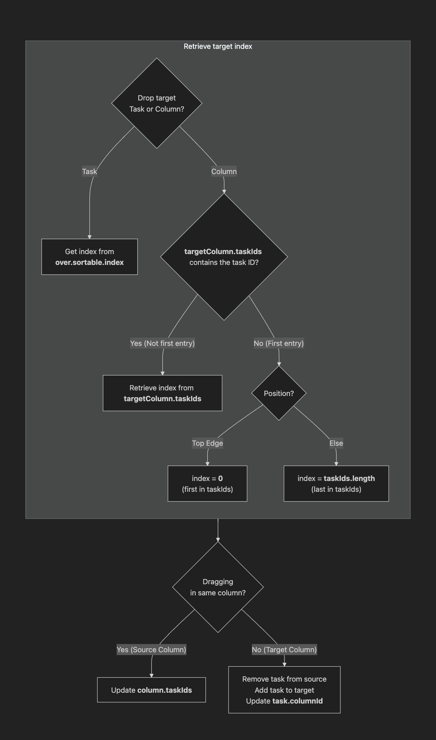์ ์ด๋ฏธ์ง์ Top Boundary๋ ์ฒซ ๋ฒ์งธ ํ์คํฌ ์์ชฝ์ ๊ฒฝ๊ณ๋ฅผ ์๋ฏธํ๋ค. ๋ง์ฝ ๊ณ์ฐํ y ์ขํ๊ฐ ์ด ๊ฒฝ๊ณ๋ณด๋ค ์์ผ๋ฉด(Drag Position 1) ๋๋๊ทธ ์์ดํ ์ ์ฒซ ๋ฒ์งธ ์์ดํ ์ผ๋ก ์์น์ํค๊ณ (์ธ๋ฑ์ค = 0), ๊ทธ ์ธ์(Drag Position 2) ๋ง์ง๋ง ์์ดํ (taskIds.length)์ผ๋ก ์์น์ํจ๋ค.