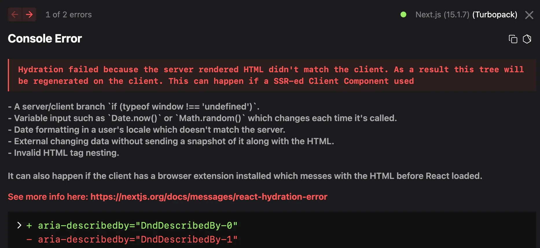 ์๋ฌ๊ฐ ๋ฐ์ํ ์ ์๋ค. ์๋ฒ ์ฌ์ด๋ ๋ ๋๋ง ์ ์์ฑํ DndContext ID์ ํด๋ผ์ด์ธํธ์์ ์์ฑํ ID๊ฐ ์ผ์นํ์ง ์์์ ๋ฐ์ํ๋ ๋ฌธ์ . ๋ฆฌ์กํธ useId ํ