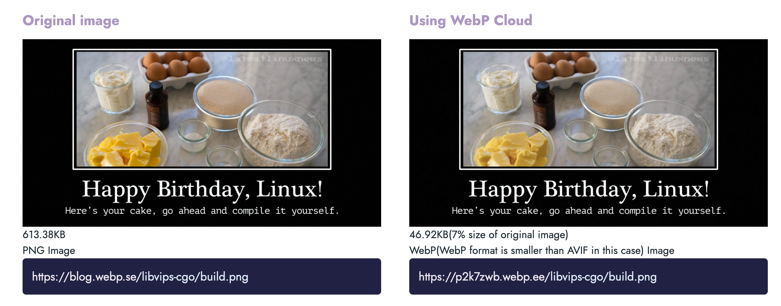 정상적으로 설정했다면 PicGo로 이미지를 업로드했을 때 WebP Cloud 주소가 생성된다. 브라우저 주소창에 생성된 이미지 주소로 접속해 보면 최적화된 이미지를 불러온다. 필자가 1.7MB 크기의 PNG 이미지를 업로드했을 때 최적화한 이미지 크기는 150KB 정도로 약 91% 줄어들었다. 상당한 감소다.