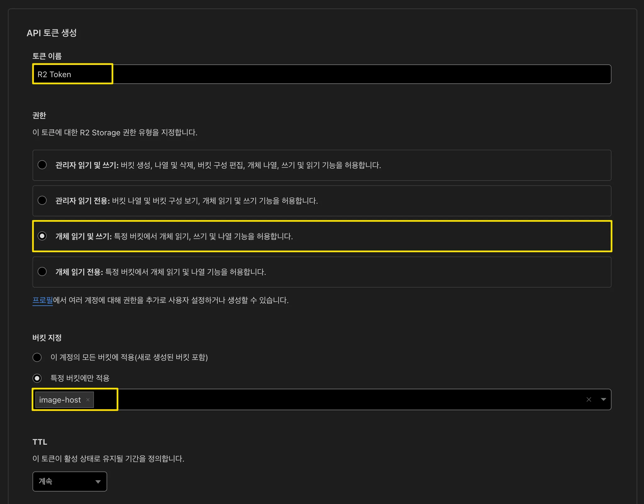 - 应用密钥 ID: Cloudflare에서 생성한 API 액세스 키 ID