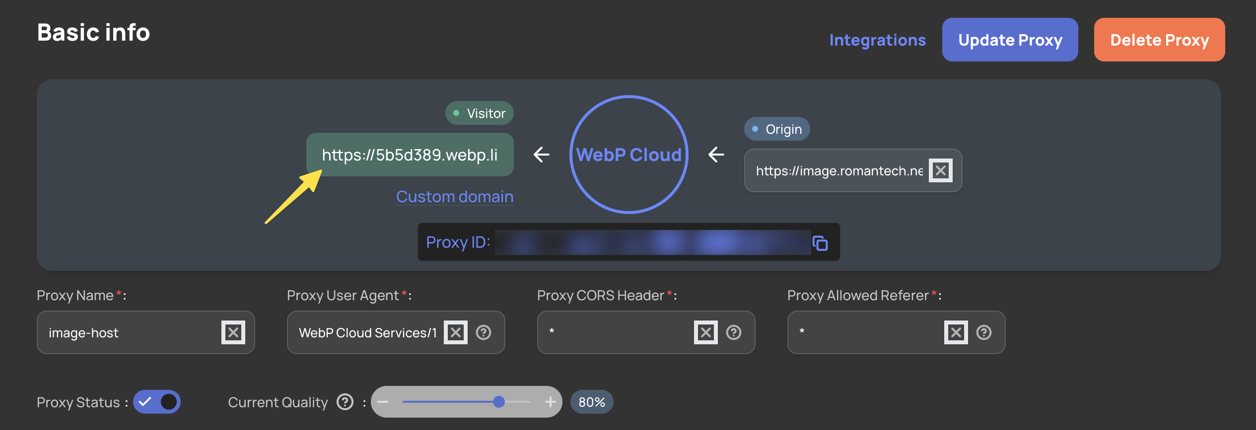 ③ 생성한 프록시 페이지에서 WebP Cloud URL 복사. 필요시 커스텀 도메인을 설정할 수도 있다.
