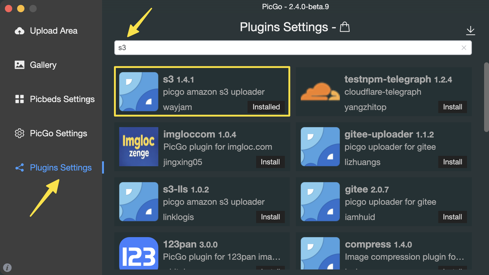 ② PicGo Main Window → Plugins Settings → s3 검색 후 설치 (wayjam 개발자)