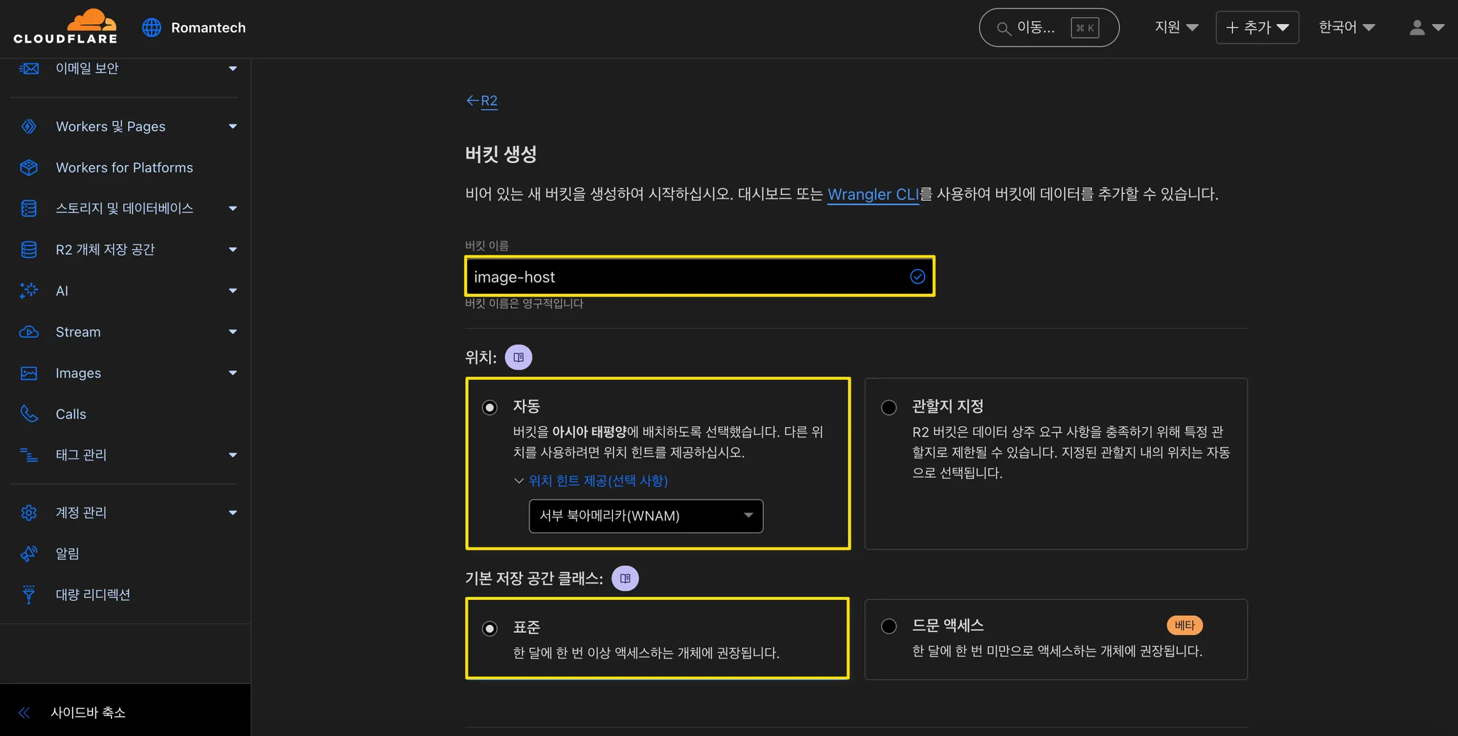 - 위치: 자동 (WebP Cloud 리전이 Hillsboro, OR에 위치하므로 위치 힌트를 서부 북아메리카로 선택)