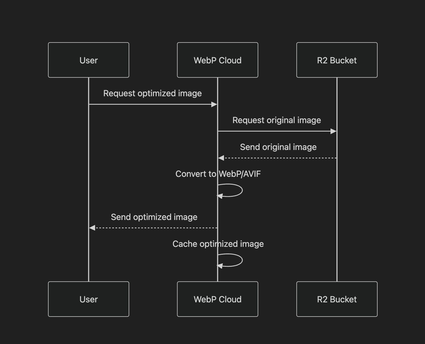- 이미지 요청: WebP Cloud URL로 이미지 요청 → R2 버킷에서 불러온 원본 이미지를 WebP/AVIF로 최적화하여 응답 후 캐싱. 이후 동일한 이미지로 요청을 받으면 캐싱한 이미지로 빠르게 응답
