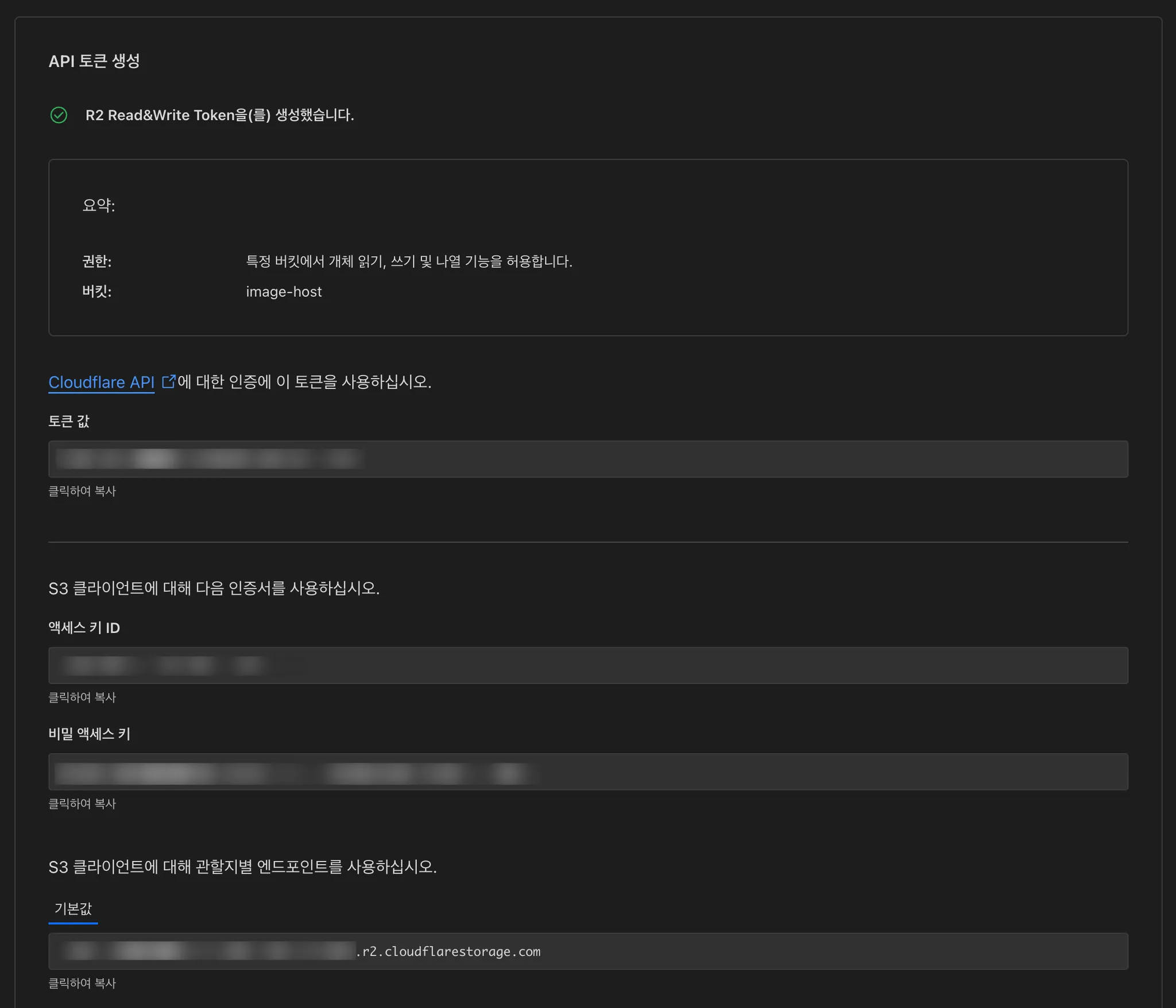 ⑤ 생성한 API 토큰 값, 액세스 ID/키, 엔드포인트 주소는 안전한 곳(비밀번호 관리자 등)에 저장