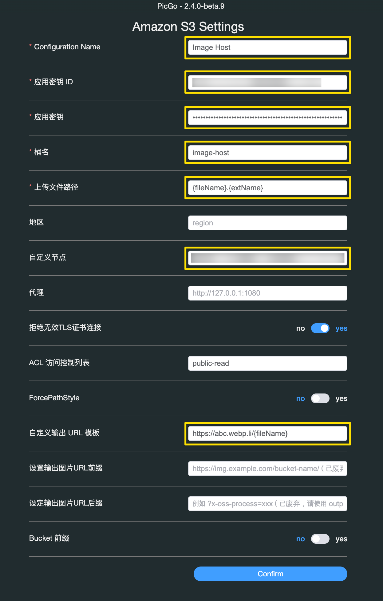 ③ PicGo Main Window → Picbeds Settings → Amazon S3 클릭 후 설정