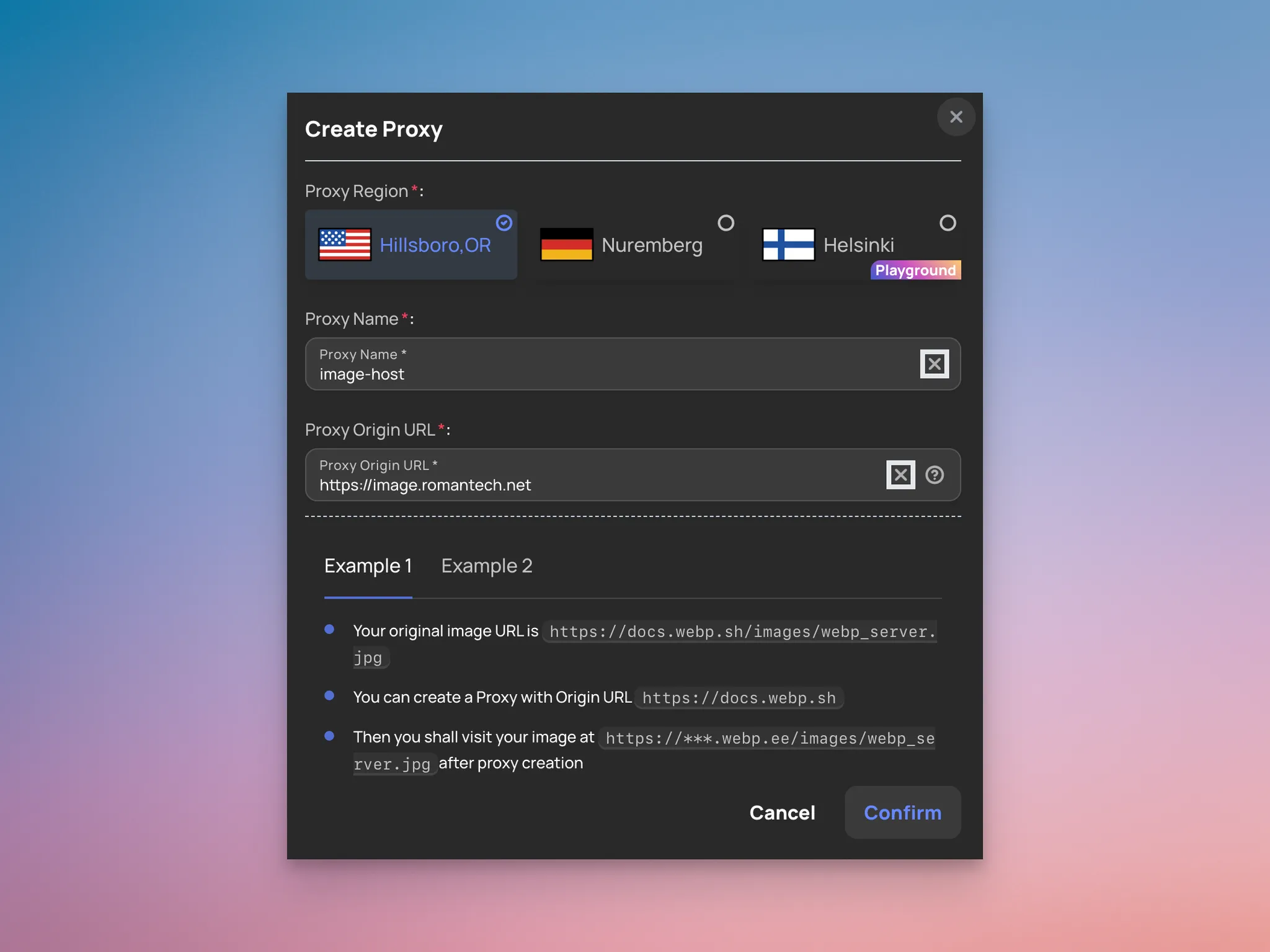 ③ 생성한 프록시 페이지에서 WebP Cloud URL 복사. 필요시 커스텀 도메인을 설정할 수도 있다.