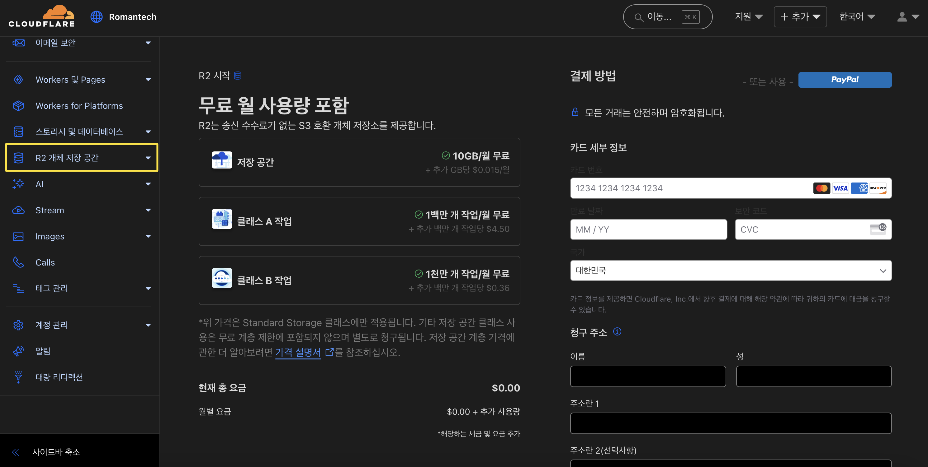 ① Cloudflare 대시보드 → R2 개체 저장공간 → 신용카드 연동(무료 사용량 초과시 요금 청구). 클래스 A 작업은 쓰기, 업로드 등에 해당되고 클래스 B 작업은 읽기, 조회 등에 해당된다.