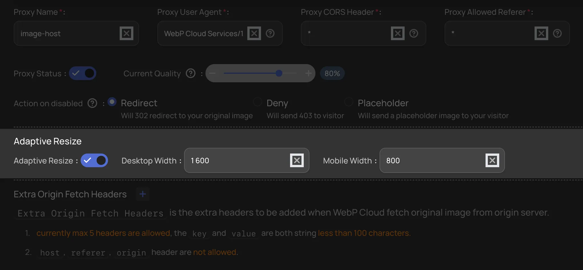 프록시 대시보드에서 Adaptive Resize 기능을 통해 데스크톱/모바일에 대한 최대 이미지 너비를 설정할 수 있다. 이 기능을 활성화하면 브라우저의 User Agent 헤더를 기반으로 데스크톱/모바일 사용 여부를 판단한 후, 설정한 기기 너비보다 더 큰 이미지는 자동으로 비율에 맞춰 리사이즈된다.