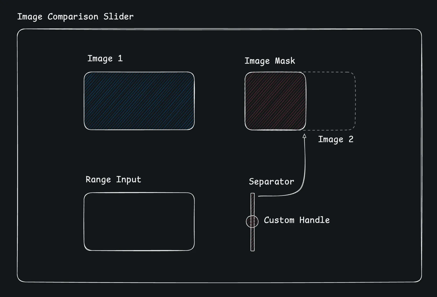 ์ด๋ฏธ์ง 1, ์ด๋ฏธ์ง 2๋ฅผ ๊ฐ์ธ๋ ๋ง์คํฌ ์์, range input, ๊ตฌ๋ถ์ (Separator) ๋ฐ ์ปค์คํ ํธ๋ค ์ด๋ ๊ฒ 4๊ฐ ๋ ์ด์ด๋ฅผ ํฌ๊ฐ์ง๋๋ก ๊ตฌ์ฑํ๋ค. ํธ๋ค์ ์์ง์ผ ๋๋ง๋ค ์ฌ๋ผ์ด๋(range input) ๊ฐ ๋งํผ ๋ง์คํฌ ์์์ ๋๋น๋ฅผ ์กฐ์ ํ๊ณ , ๋์น๋ ๋ถ๋ถ์ ๋ณด์ด์ง ์๋๋ก ์ฒ๋ฆฌํ๋ฉด(overflow: hidden) ๊ธฐ๋ณธ์ ์ธ ์ด๋ฏธ์ง ๋น๊ต ์ฌ๋ผ์ด๋๊ฐ ์์ฑ๋๋ค.