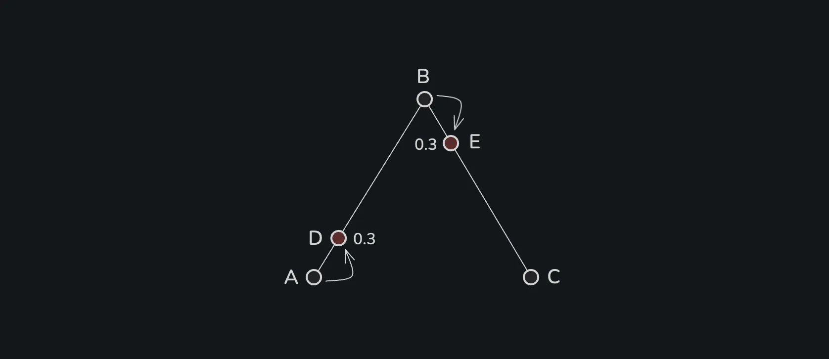 ๊ฐ ์ ๋ถ์ ๋์ผํ ๋น์จ t(0 ≤ t ≤ 1)๋ก ๋๋๋ค(๋ด๋ถ). ์๋ฅผ ๋ค์ด t๊ฐ 0.3์ด๋ผ๋ฉด A์์ B ๋ฐฉํฅ์ผ๋ก 30% ์ด๋ํ ์ง์ D์, B์์ C ๋ฐฉํฅ์ผ๋ก 30% ์ด๋ํ ์ง์ E๊ฐ ๋ง๋ค์ด์ง๋ค.