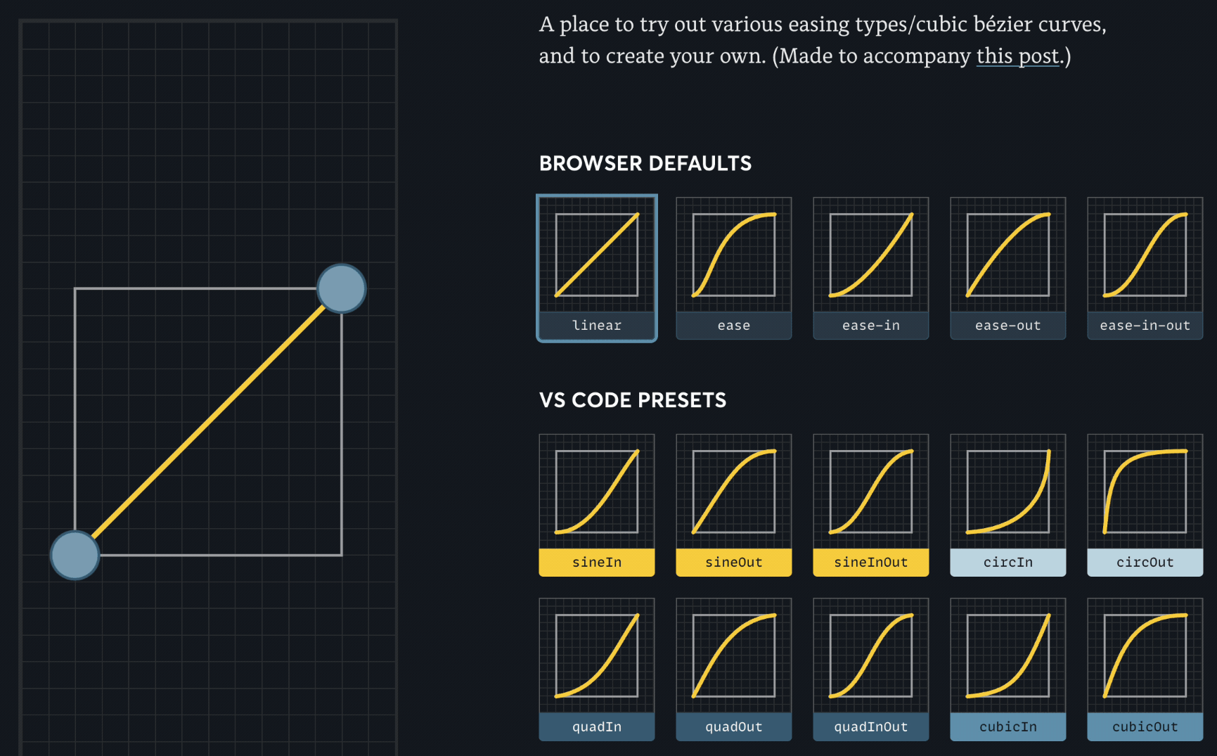 ์ด๋ค. ๊ฐ ๊ฐ์ ์๋์ฒ๋ผ cubic-bezier ๊ณก์ ์ผ๋ก ๋ฏธ๋ฆฌ ์ ์๋์ด ์๋ค.