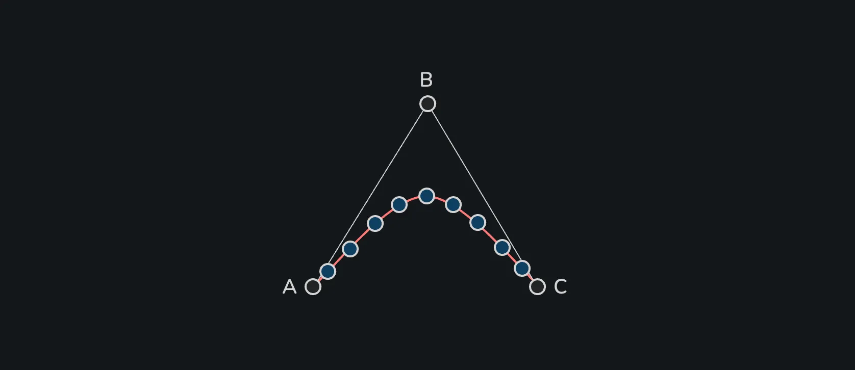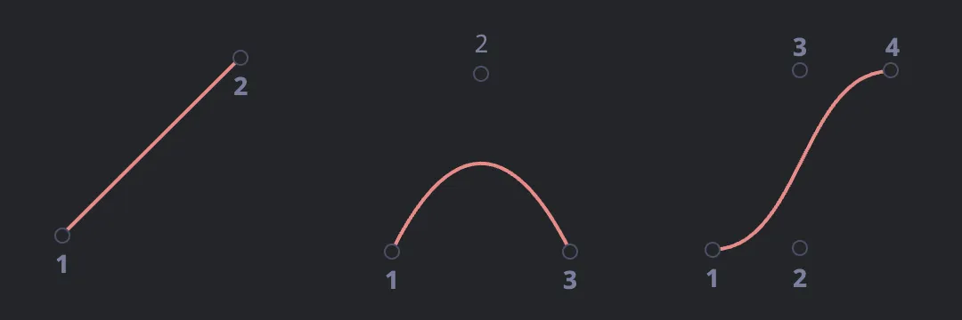์ฐธ๊ณ ๋ก ๊ฐ ์กฐ์ ์ ์์ ๊ณฑํด์ง $(1-t)^2$, $2(1-t)t$, $t^2$ ๊ฐ์ ํญ๋ค์ ๋ฒ์คํ์ธ ๊ธฐ์ ๋คํญ์(Bernstein basis polynomials) ์ด๋ผ๊ณ ๋ถ๋ฅธ๋ค. ์ด๋ฌํ ํญ๋ค์ $t$ ๊ฐ์ ๋ฐ๋ผ ๊ฐ ์กฐ์ ์ ์ด ๊ณก์ ์์ ์ $P$์ ์ผ๋ง๋ ํฐ ์ํฅ(๊ฐ์ค์น)์ ๋ฏธ์น๋์ง ๊ฒฐ์ ํ๋ค.