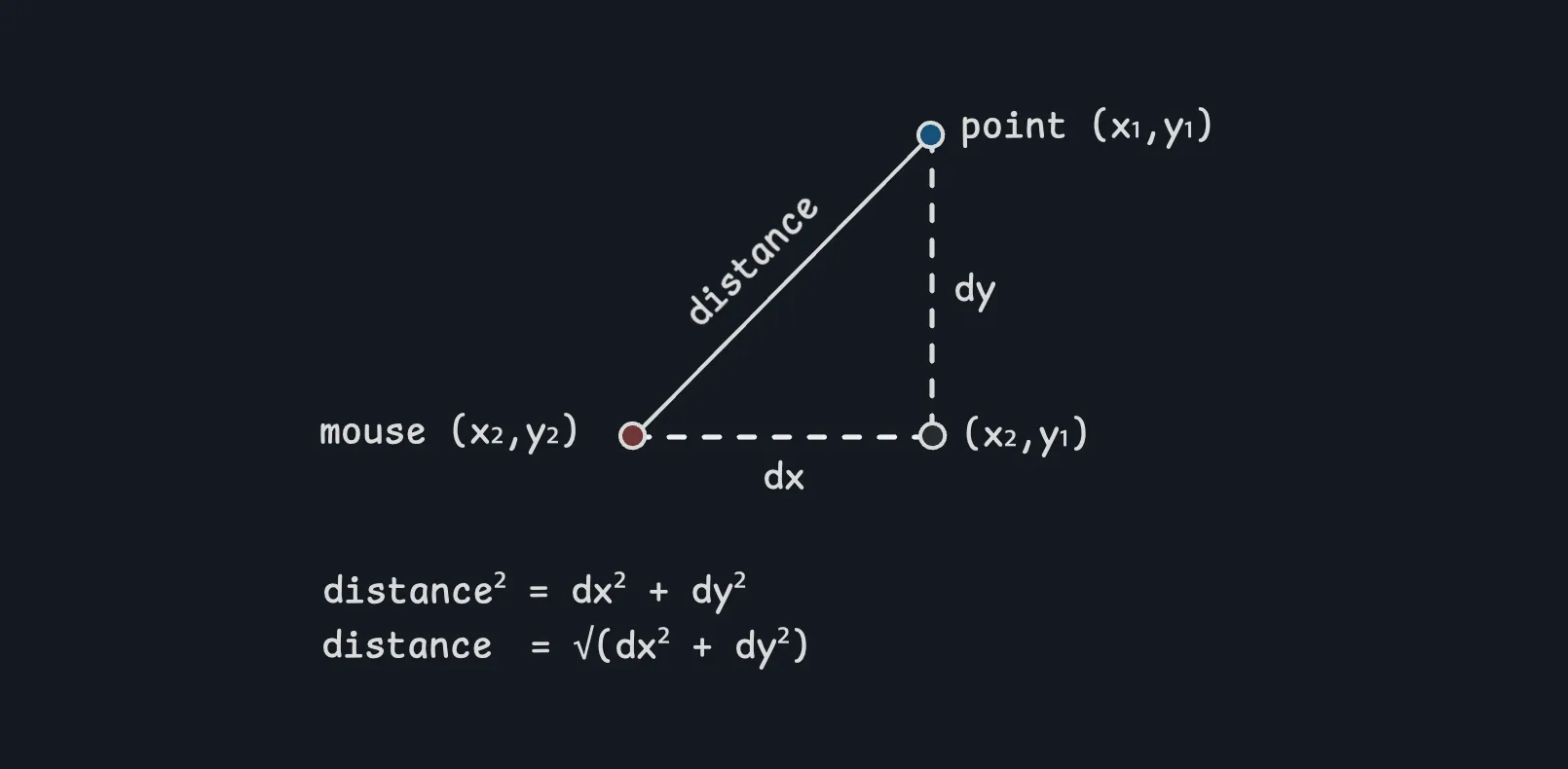 // ํผํ๊ณ ๋ผ์ค ์ ๋ฆฌ๋ฅผ ์ด์ฉํด point์ mouse ์ฌ์ด์ ๊ฑฐ๋ฆฌ(๋น๋ณ) ๊ณ์ฐ