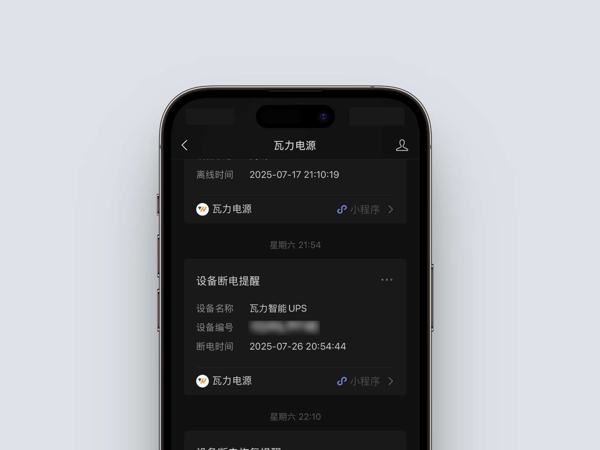 UPS가 위챗 WalleCube 미니앱에 연동된 상태에서, WalleCube 위챗 공식 계정(瓦力电源公众号)을 팔로우하면 배터리/AC 모드 전환, 전력 사용량, UPS 오프라인 상태에 대한 실시간 알림을 받을 수 있다. 알림은 WalleCube 공식 계정을 통해 전달된다.