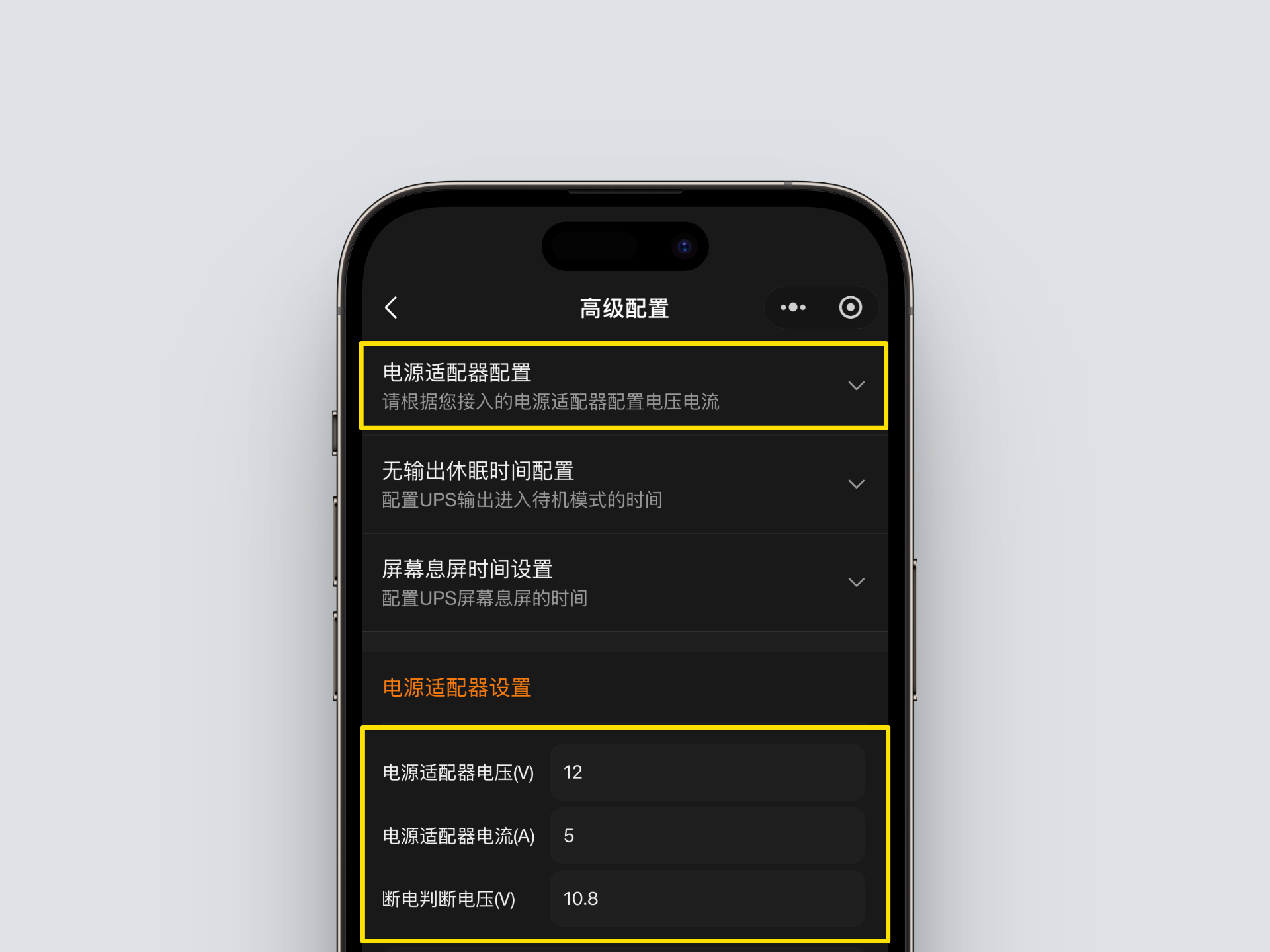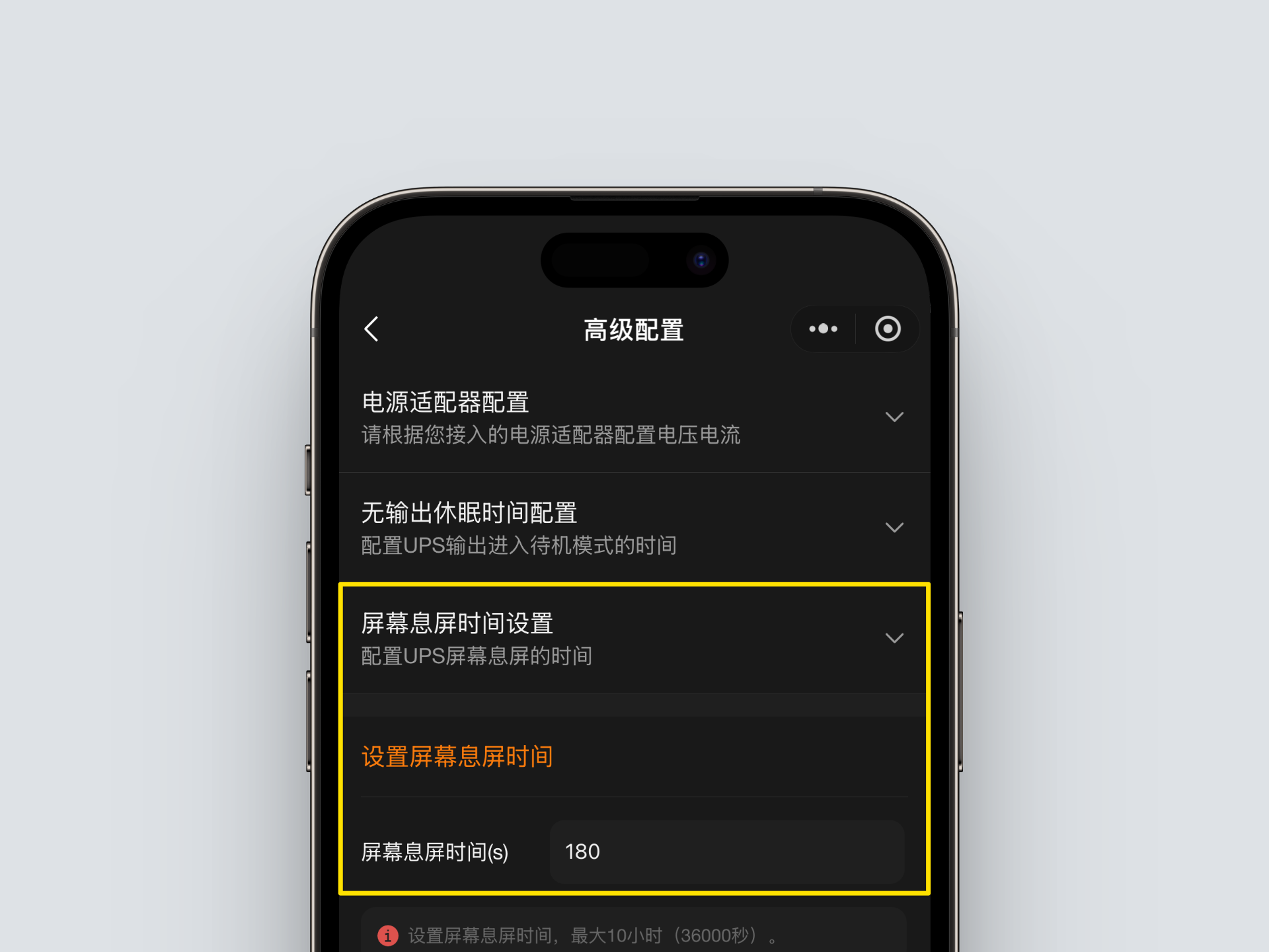 UPS 본체의 화면은 기본적으로 5분(300초) 후에 꺼진다. 위챗 WalleCube 미니앱 > 高级配置(고급설정) > 屏幕休眠时间(화면 절전 시간) 설정 페이지에서 30~36000초 사이의 화면 꺼짐 시간을 조정할 수 있다.