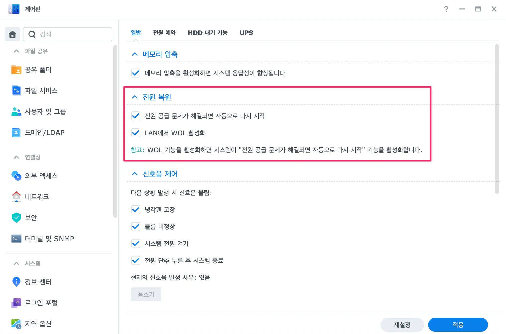 [전원 공급 문제가 해결되면 자동으로 다시 시작]은 UPS가 배터리 모드에서 AC 모드로 전환될 때 NAS가 자동으로 켜지도록 하는 기능이다. [LAN에서 WOL 활성화]는 네트워크를 통해 원격으로 NAS를 켤 수 있는 기능이다. 이 두 옵션을 모두 활성화하면, 정전 후 전원이 복구될 때 NAS가 자동으로 부팅되고, 필요할 때마다 원격으로 시스템을 시작할 수 있다.