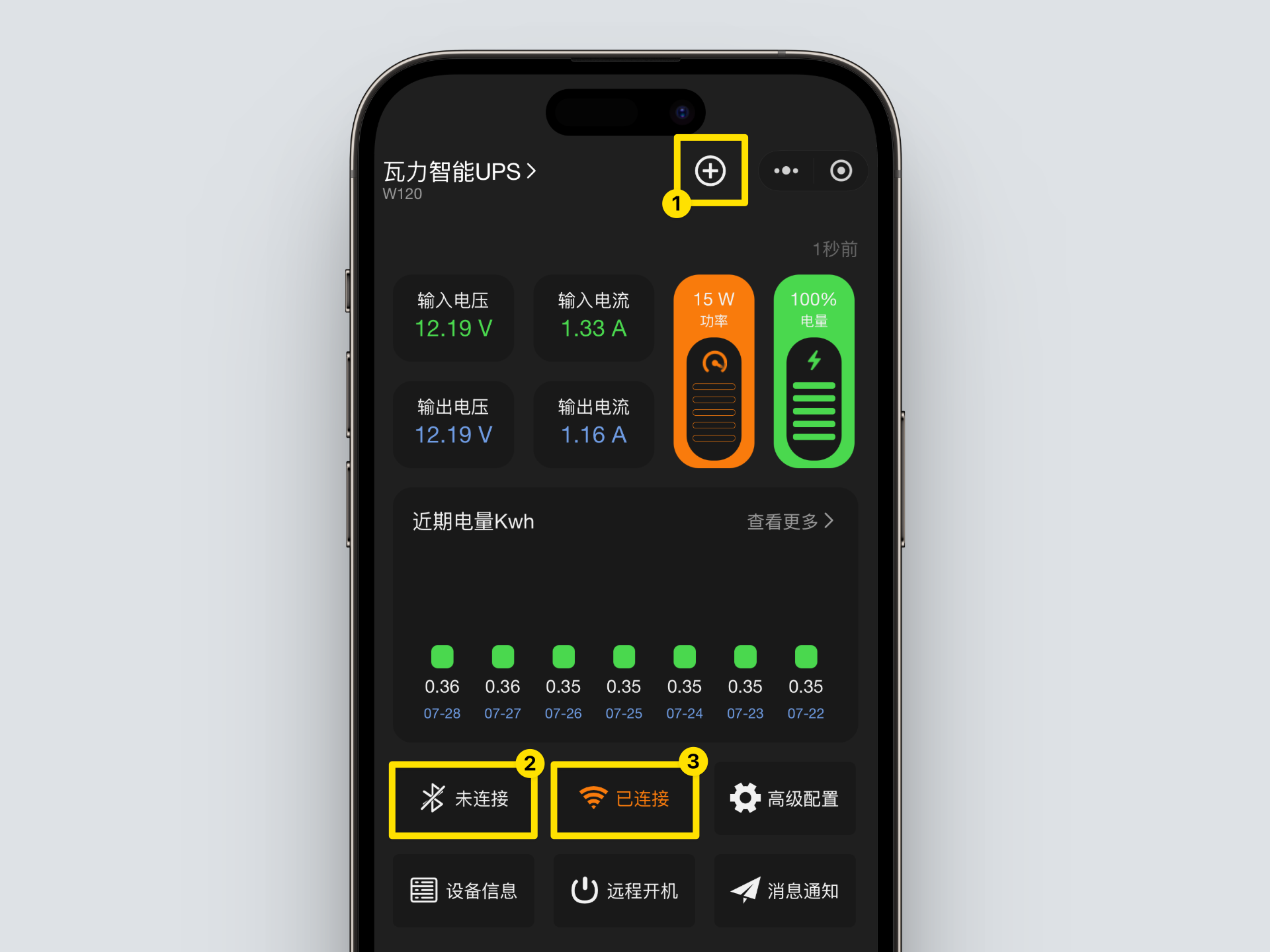 UPS가 위챗 WalleCube 미니앱에 연동된 상태에서, WalleCube 위챗 공식 계정(瓦力电源公众号)을 팔로우하면 배터리/AC 모드 전환, 전력 사용량, UPS 오프라인 상태에 대한 실시간 알림을 받을 수 있다. 알림은 WalleCube 공식 계정을 통해 전달된다.