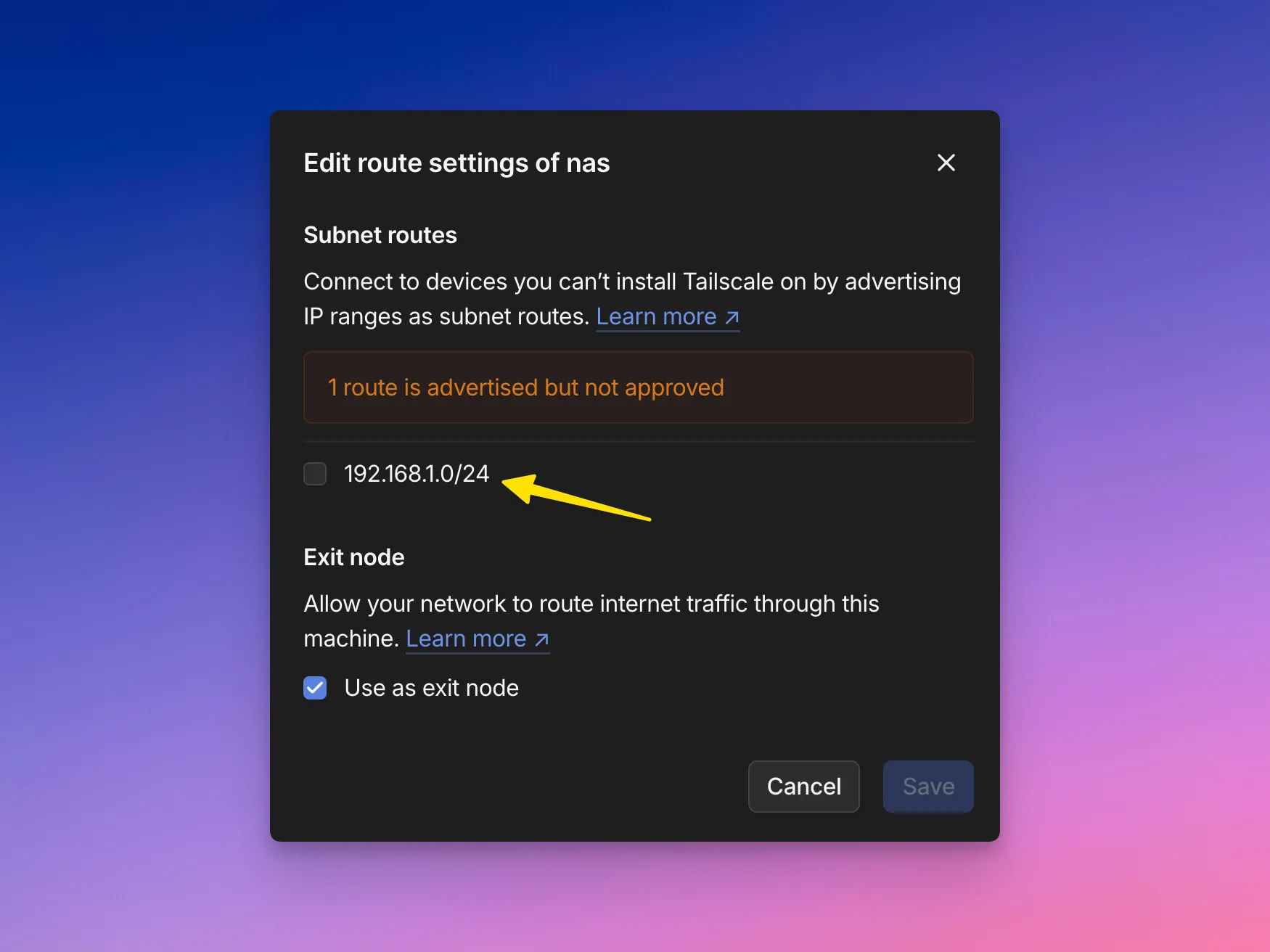tailscale set --advertise-routes=192.168.1.0/24