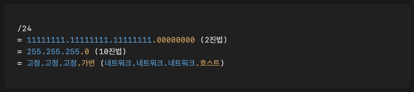 192.168.1.0/24 형식의 주소에서 /24는 서브넷 마스크를 의미한다. 서브넷 마스크는 IP 주소에서 네트워크 영역과 호스트 영역을 구분하는 기준으로, 앞의 24비트가 네트워크 주소임을 나타낸다. IPv4는 총 32비트이므로 남은 8비트는 호스트 주소로 사용된다.