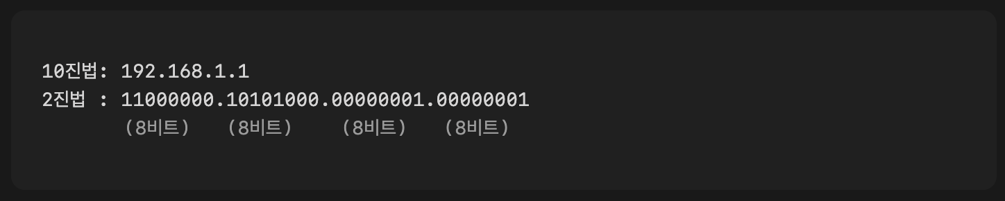 우리가 흔히 사용하는 IP 주소(IPv4)는 총 32비트(bit)로 구성되며, 점(.)으로 구분된 4개의 8비트 숫자로 표현한다. 8비트는 0부터 255(11111111)까지의 값을 가질 수 있으므로, IPv4 주소는 0.0.0.0 부터 255.255.255.255 까지의 범위를 갖는다.