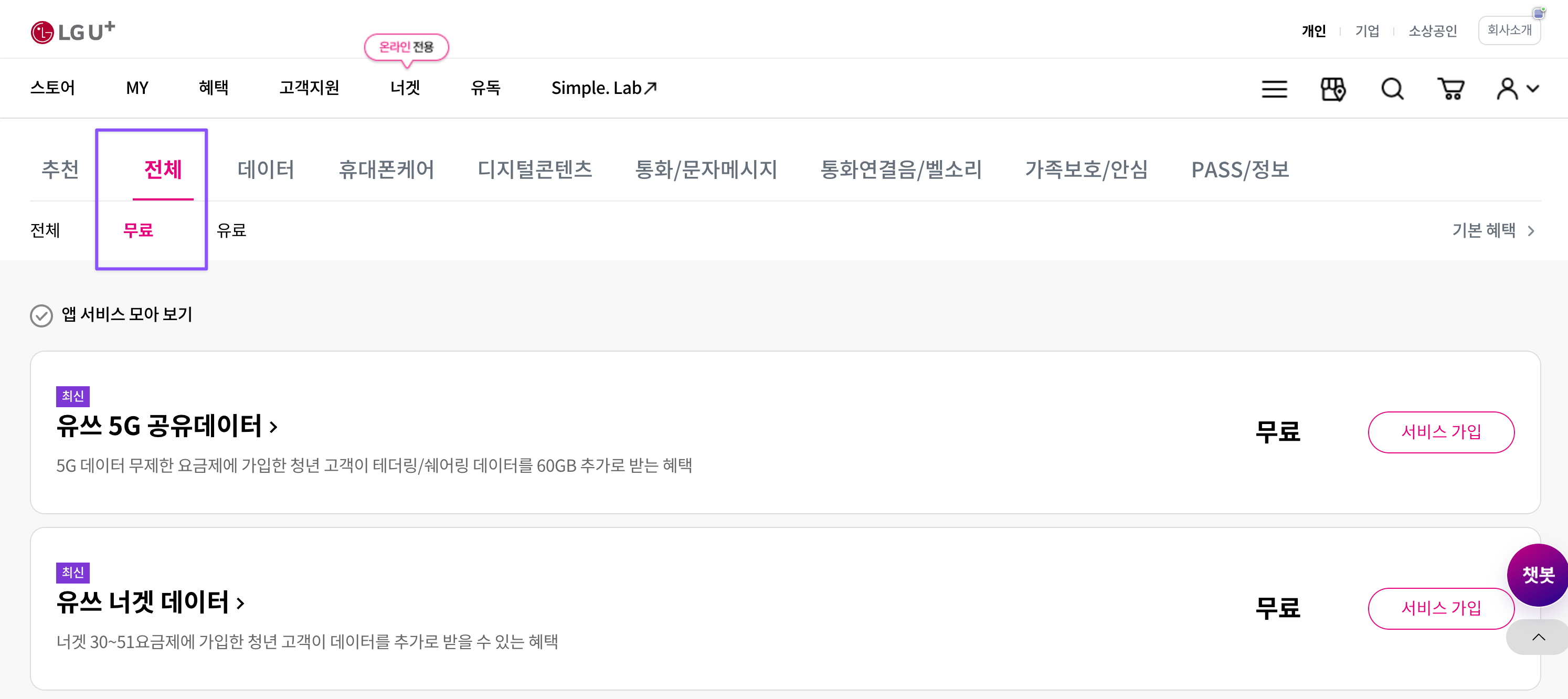 LG U+ ํํ์ด์ง > ์คํ ์ด > ๋ชจ๋ฐ์ผ ์๋น์ค > ์ ์ฒด๋ฅผ ํด๋ฆญํ๋ฉด ๊ฐ์ ํ ์ ์๋ ๋ชจ๋ ๋ถ๊ฐ ์๋น์ค ๋ชฉ๋ก์ด ๋์จ๋ค. ์ด ํ์ด์ง์์ [๋ฌด๋ฃ]์ ์ฒดํฌํ๋ฉด ๋ฌด๋ฃ ์๋น์ค๋ง ํํฐ๋งํด์ ๋ณผ ์ ์๋ค.