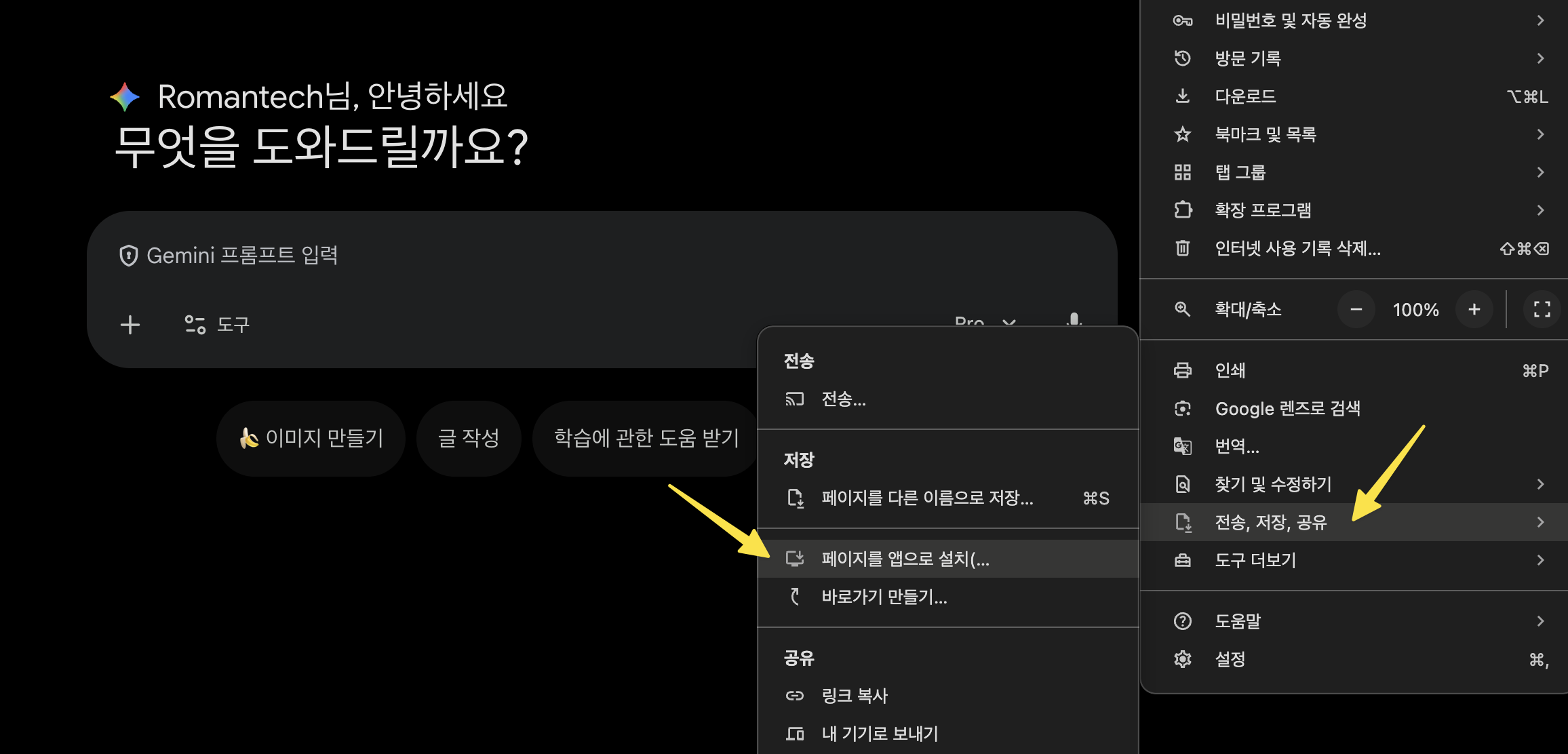 먼저 크롬 혹은 엣지 브라우저로 제미나이 사이트에 접속한다. 브라우저 우측 상단 [점 3개 메뉴] > [전송, 저장, 공유] > [페이지를 앱으로 설치] 버튼을 클릭하면 PWA가 설치되고 Dock에 추가된다.