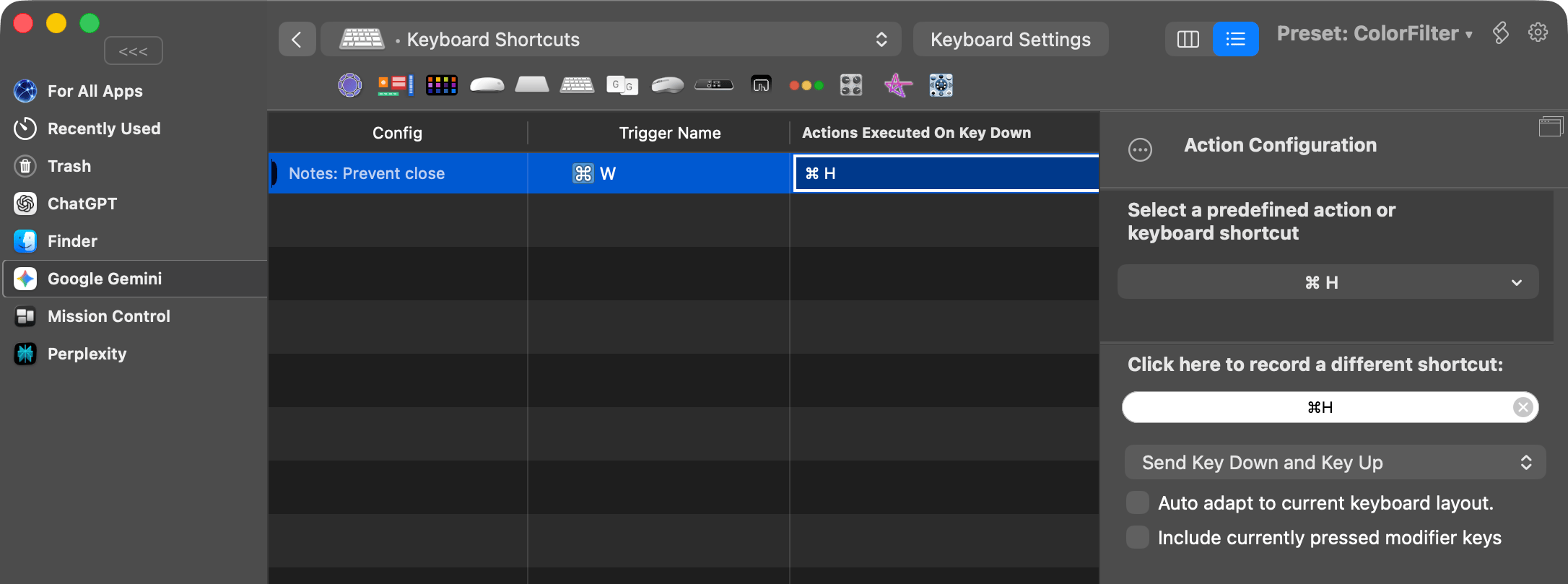 🔍 BetterTouchTool(BTT)를 사용 중이라면 더 간단하게 설정할 수 있다. Keyboard Shortcuts 항목에 Google Gemini 앱을 추가한 뒤 CMD + W 입력을 CMD + H 동작으로 매핑해 주면 된다.