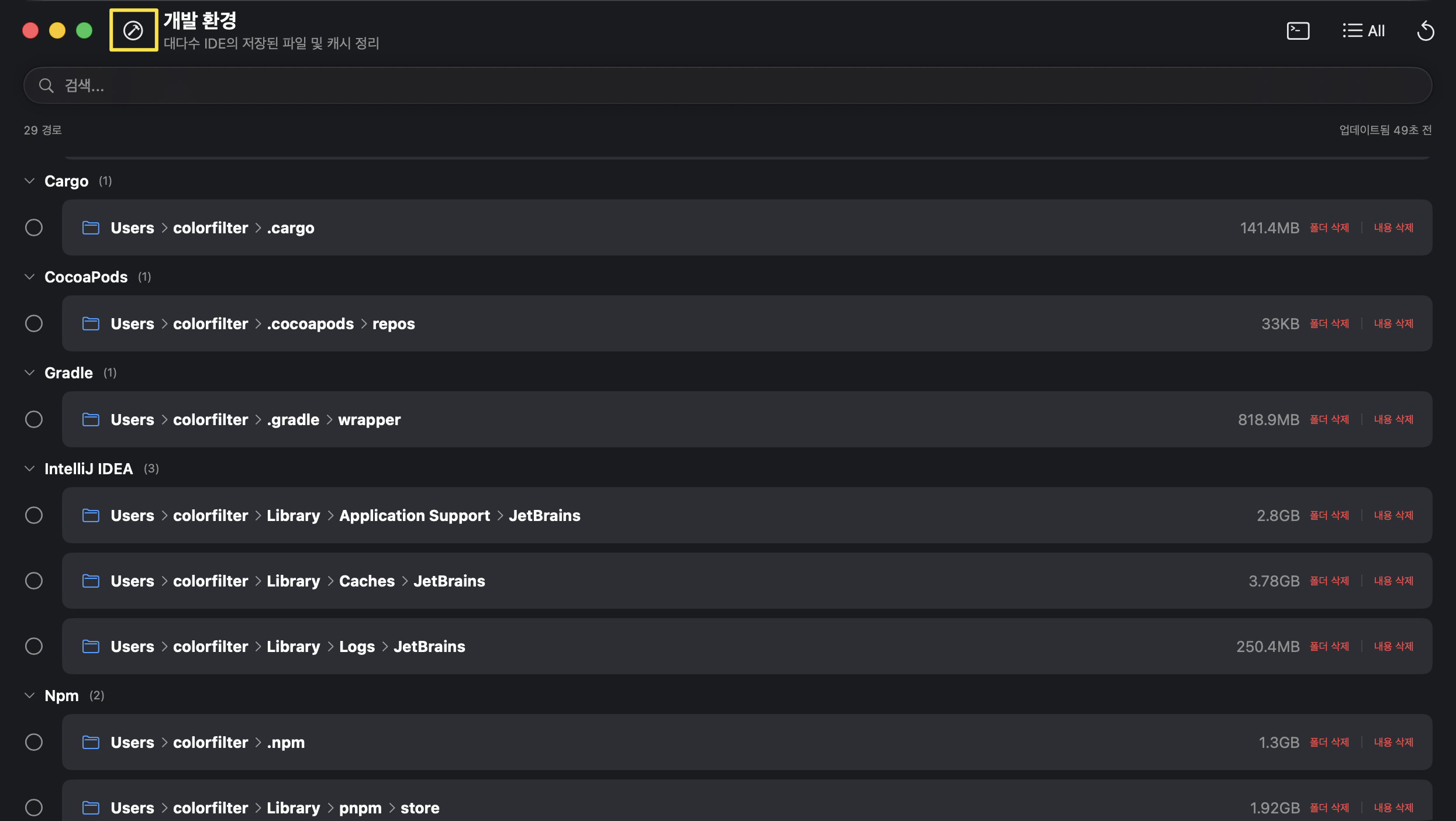 IDE, 빌드 도구, 패키지 매니저 등이 생성한 대용량 캐시·아티팩트(빌드 산출물, 인덱스, 로그 등)를 정리할 수 있다. 개발을 하다 보면 빌드 캐시나 각종 임시 파일이 수십 기가바이트까지 쌓이는 경우가 흔하다. 이런 파일들은 시스템 깊숙이 숨겨진 폴더에 저장돼서 직접 관리하기 번거롭다. PearCleaner를 사용하면 이러한 파일들을 유형별로 찾아서 말끔하게 정리할 수 있다.