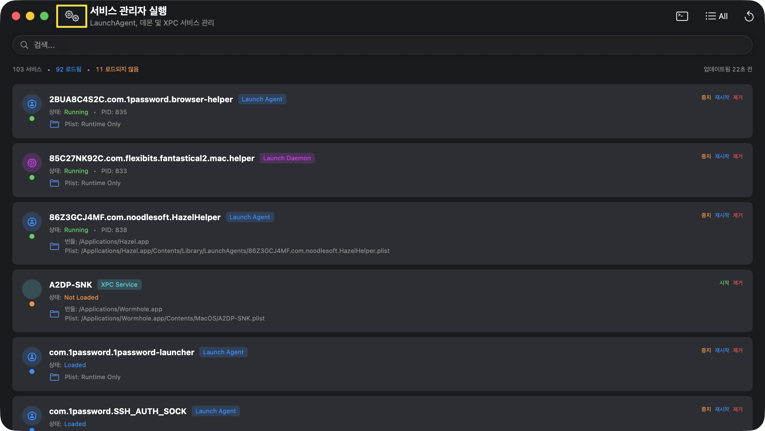 시스템 로그인 시 자동 실행되거나 백그라운드에 상주하는 런치 에이전트(Launch Agents) 및 데몬(Daemons)을 조회하고 관리한다. 이미 삭제된 앱과 연동되어 불필요하게 시스템 리소스를 점유하거나, 부팅 속도를 저하시키는 좀비 프로세스(Orphaned Services)를 식별하여 정리할 수 있다.