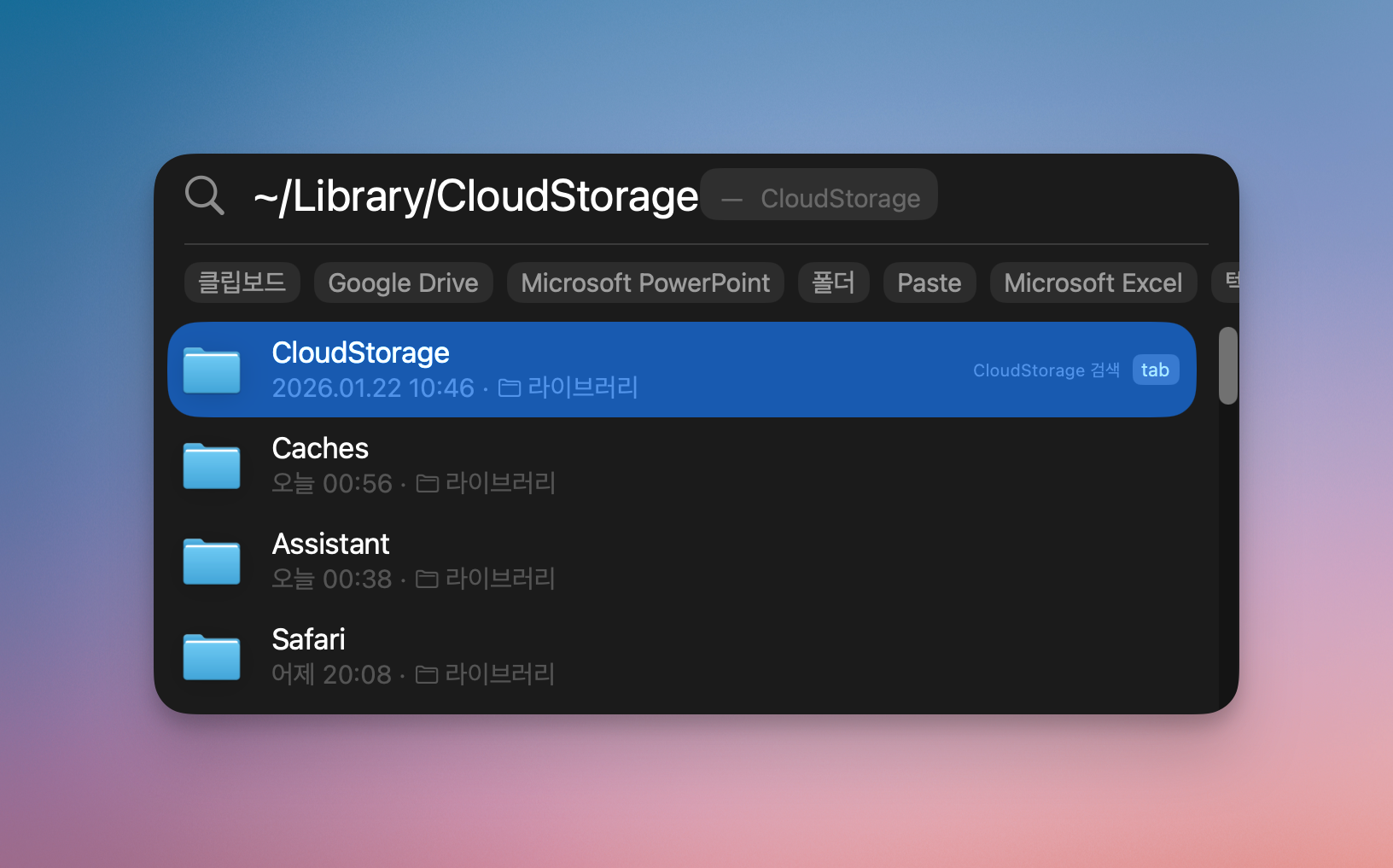 macOS는 ~/Library/CloudStorage 폴더에서 클라우드 데이터를 통합 관리한다. 이 경로를 Spotlight 검색창에 붙여넣고 엔터를 누르면 해당 폴더가 열린다. 이 폴더를 PearCleaner 제외 목록으로 드래그 앤 드롭해서 추가해 두자.