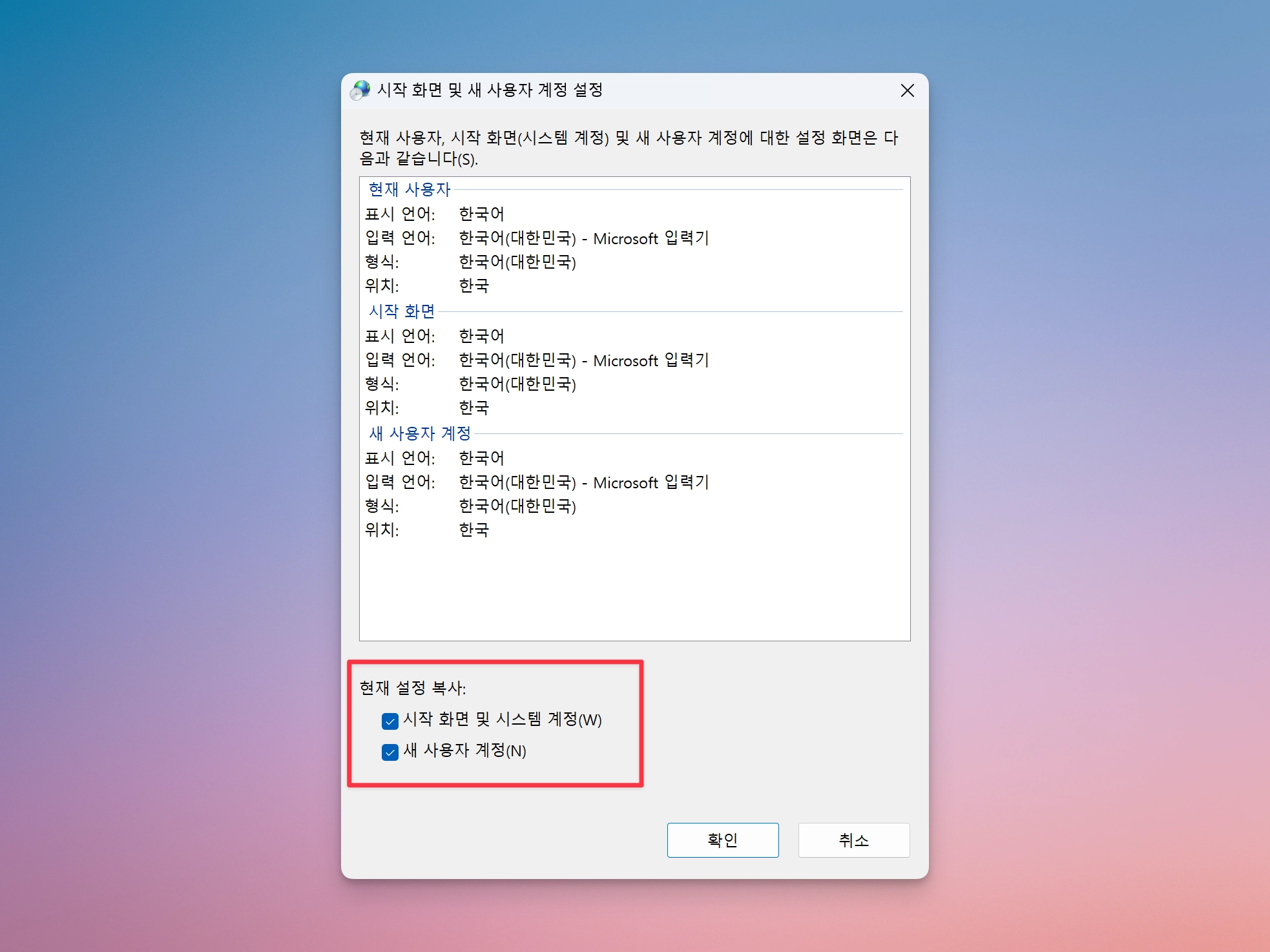 ⑦ 윈도우에서 Win + R > intl.cpl 입력 후 확인 > [관리자 옵션] 탭 > [설정 복사] 클릭 > 하단 [시작 화면 및 시스템 계정], [새 사용자 계정] 두 항목에 체크 후 확인. 이렇게 하면 현재 설정(한국어 Only)을 시스템 전체에 강제로 복사해서 ENG 입력기가 되살아 나는 것을 방지할 수 있다.