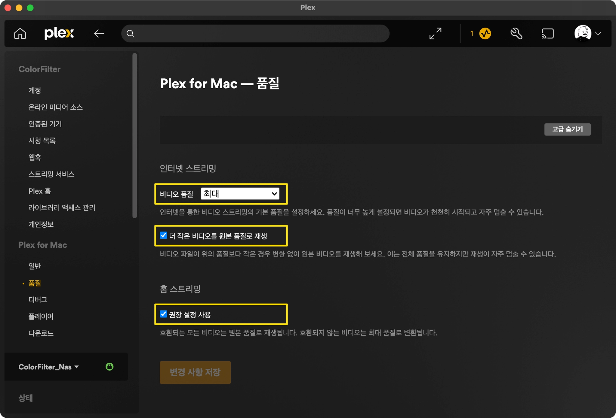 결국 서버 부하를 줄이고 끊김 없는 재생을 원한다면 웹보단 전용 애플리케이션을 사용하는 것이 좋다. Plex 설정을 보면 다양한 옵션이 있는데, 직접 테스트한 결과를 바탕으로 추천 세팅을 소개하고자 한다.